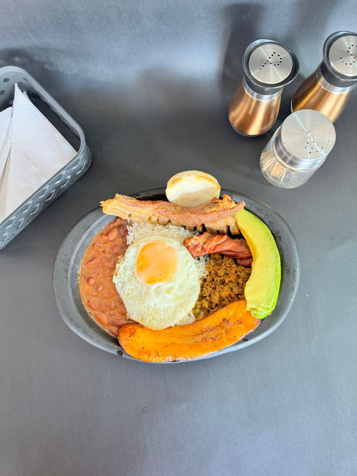 Deliciosa bandeja Paisa con arroz, frijoles, carne molida, aguacate, huevo, chorizo, chicharrón y arepa.
