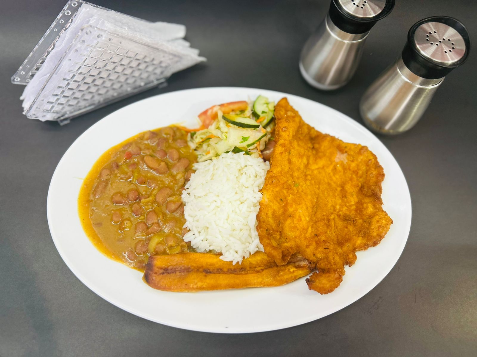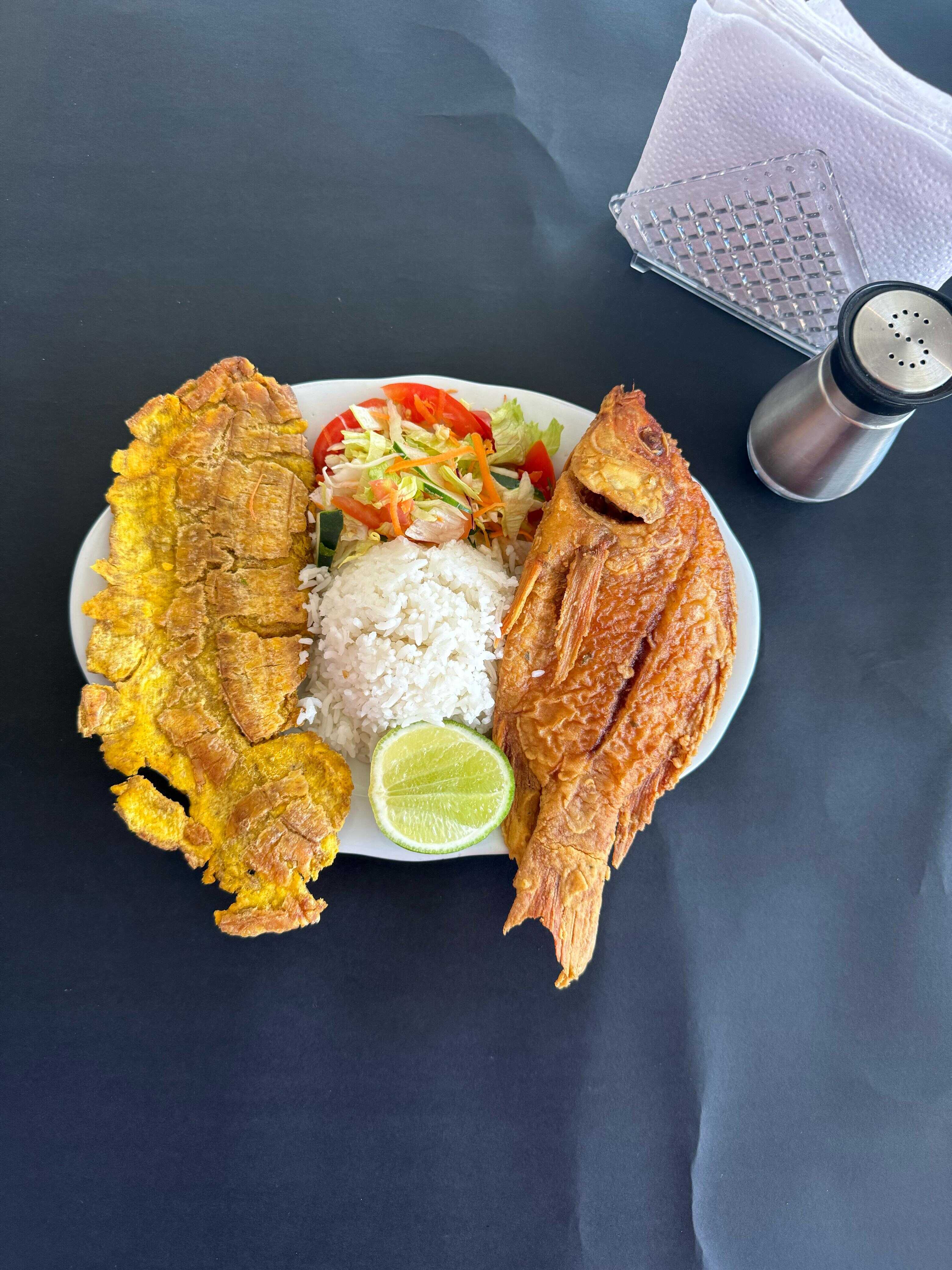 Delicioso almuerzo ejecutivo con Tilapia Frita, frijoles, ensalada, limonada y sopa del día.