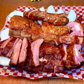 Delicioso asado mixto acompañado de bondiola, costilla de búfalo, chorizo en trozos, papa salada y arepa.