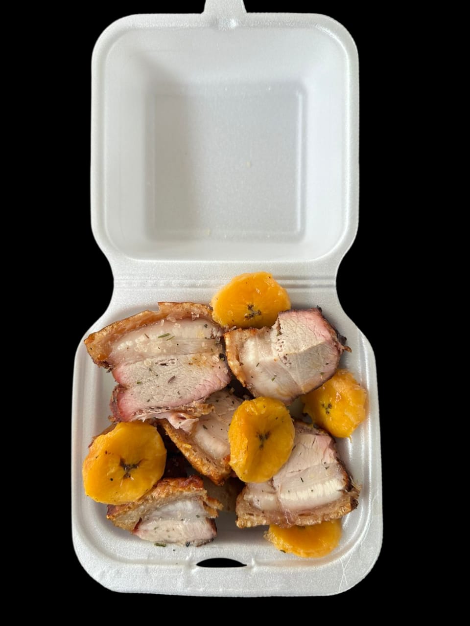 235 g de panceta (chicharrón, costilla y carne pulpa). Acompañada de papa cocida. Para una persona