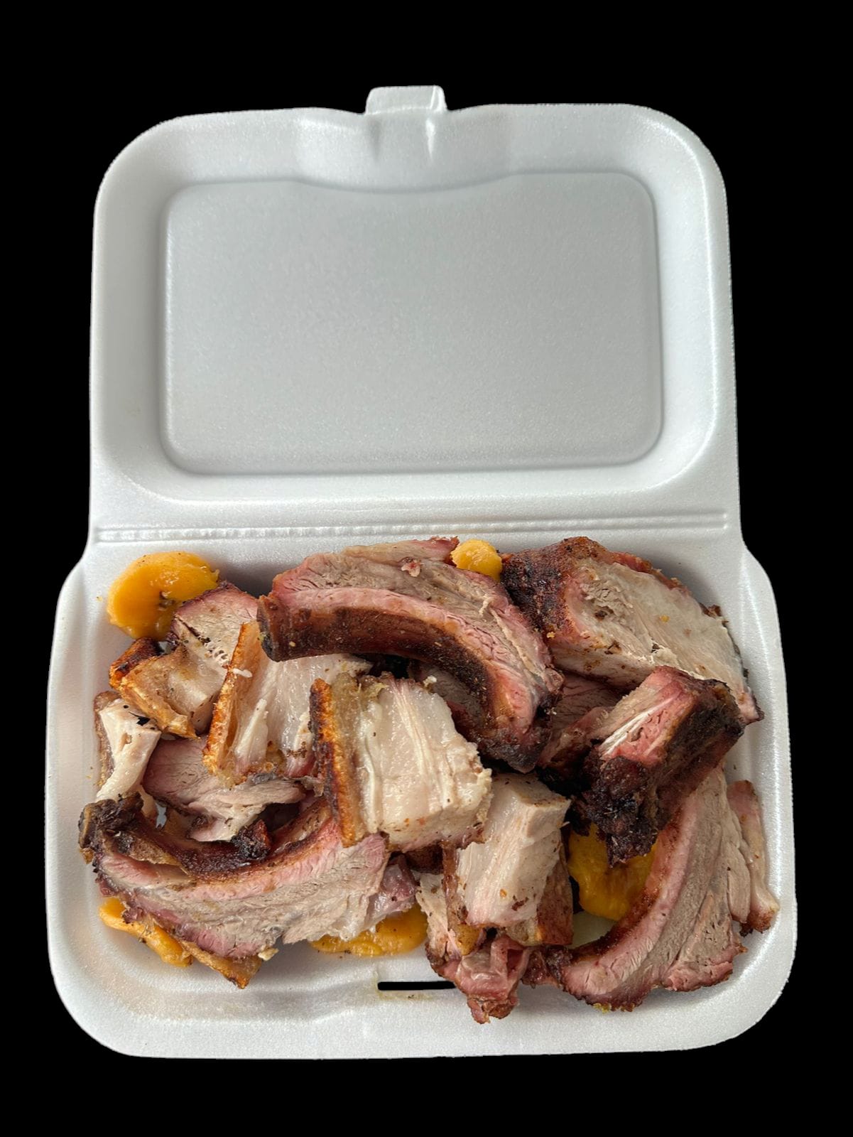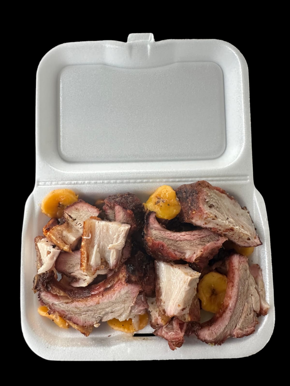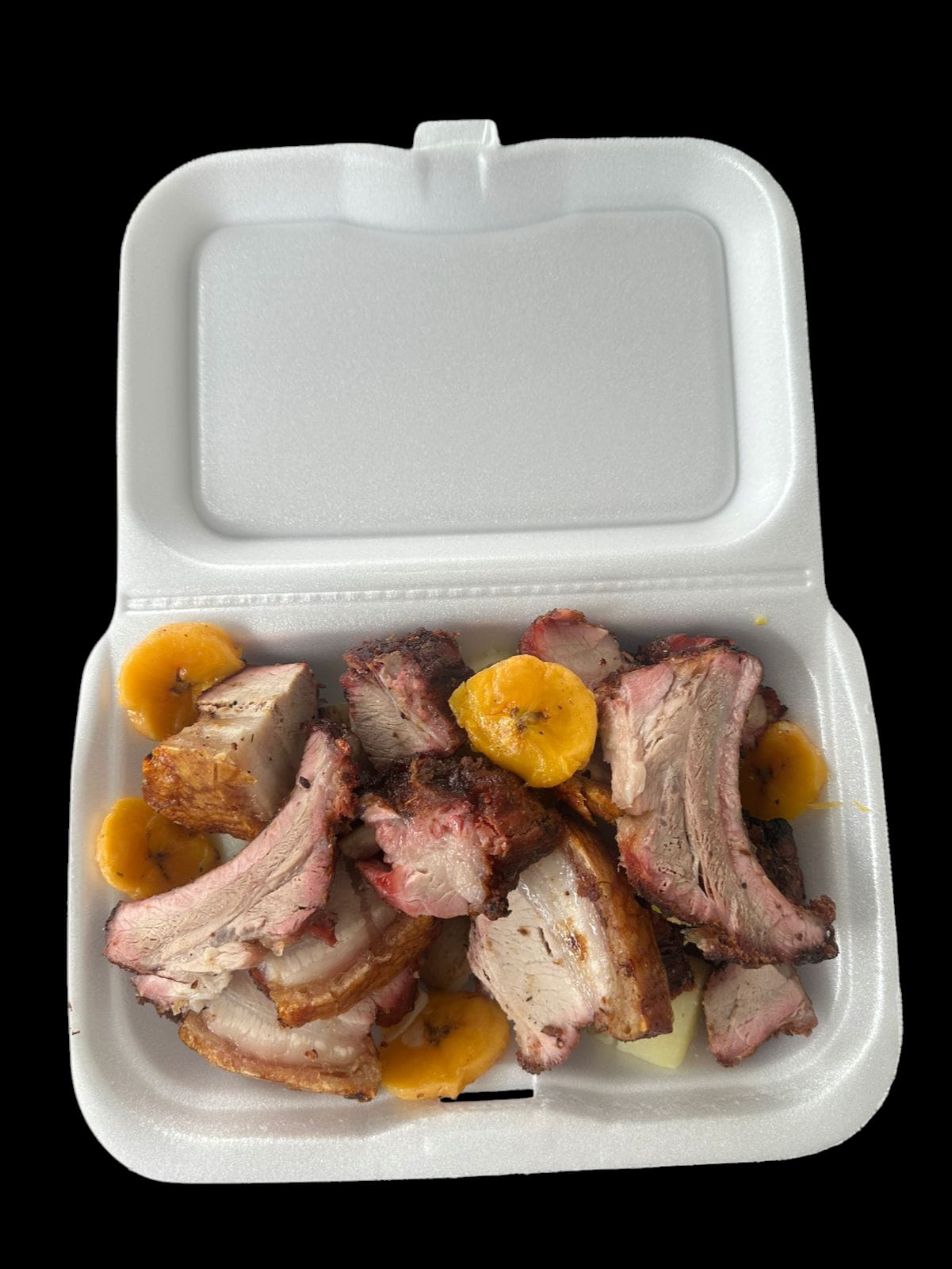 455 g de panceta (chicharrón, costilla y carne pulpa) acompañados por papa cocida.