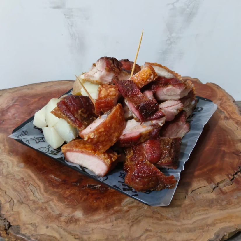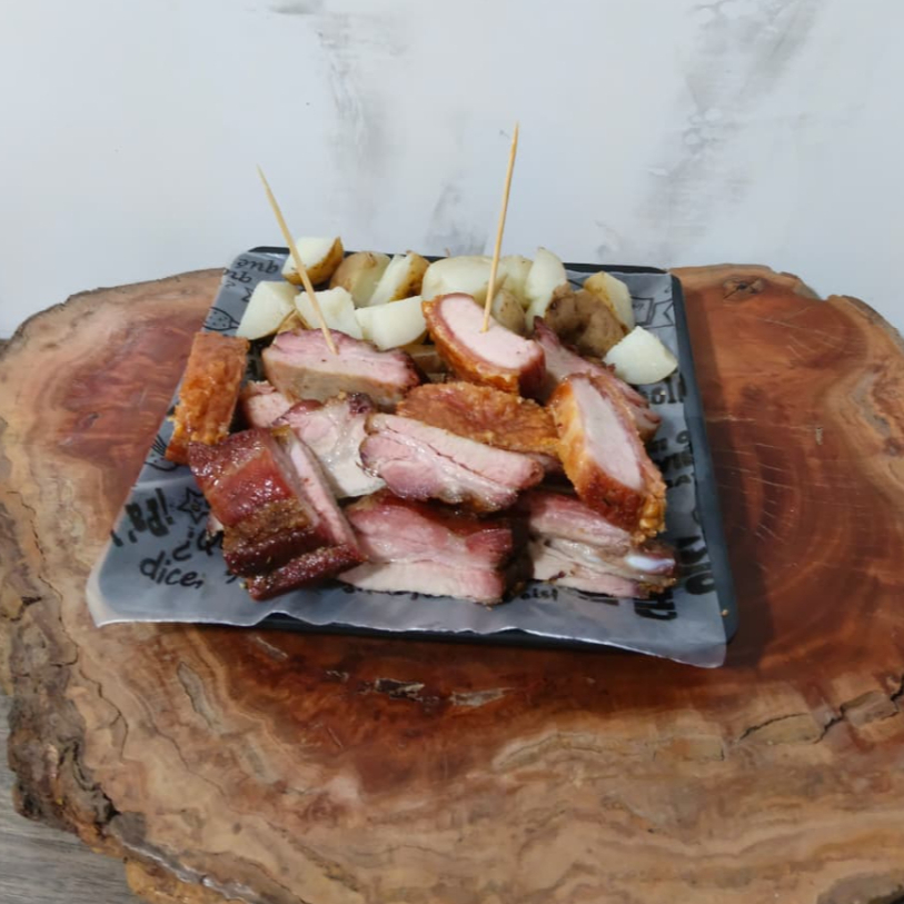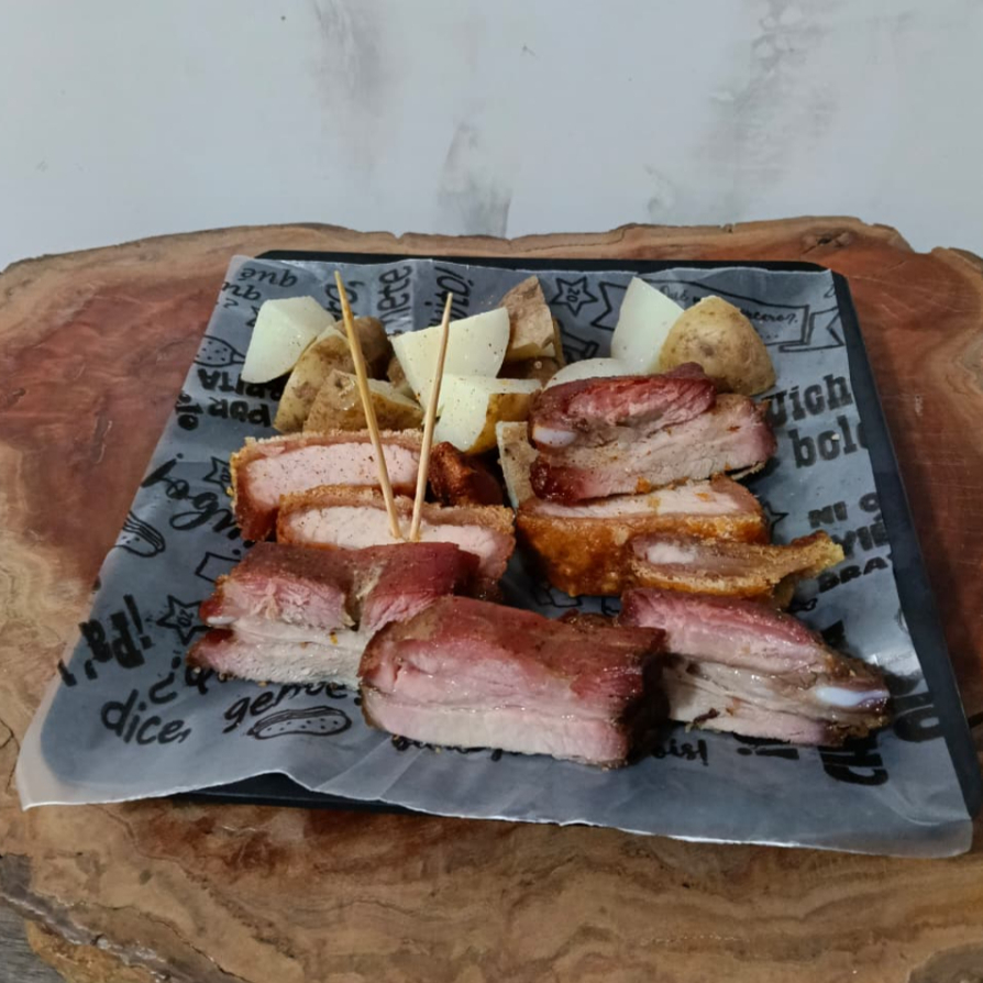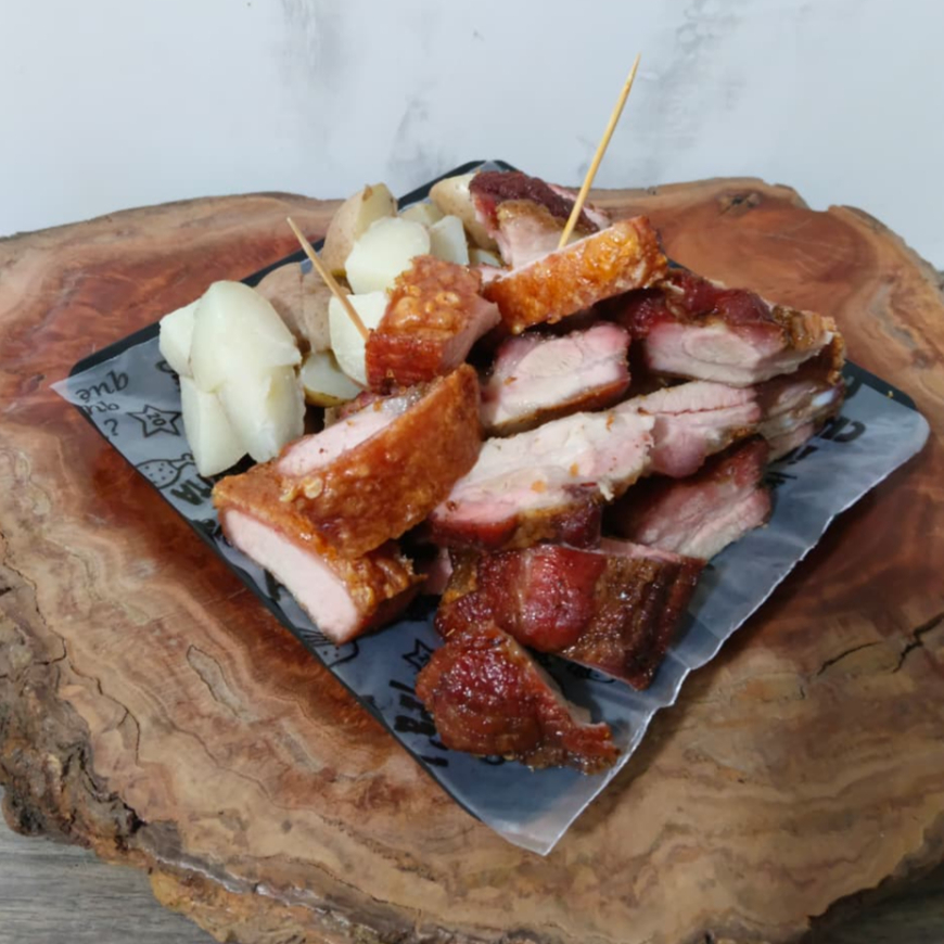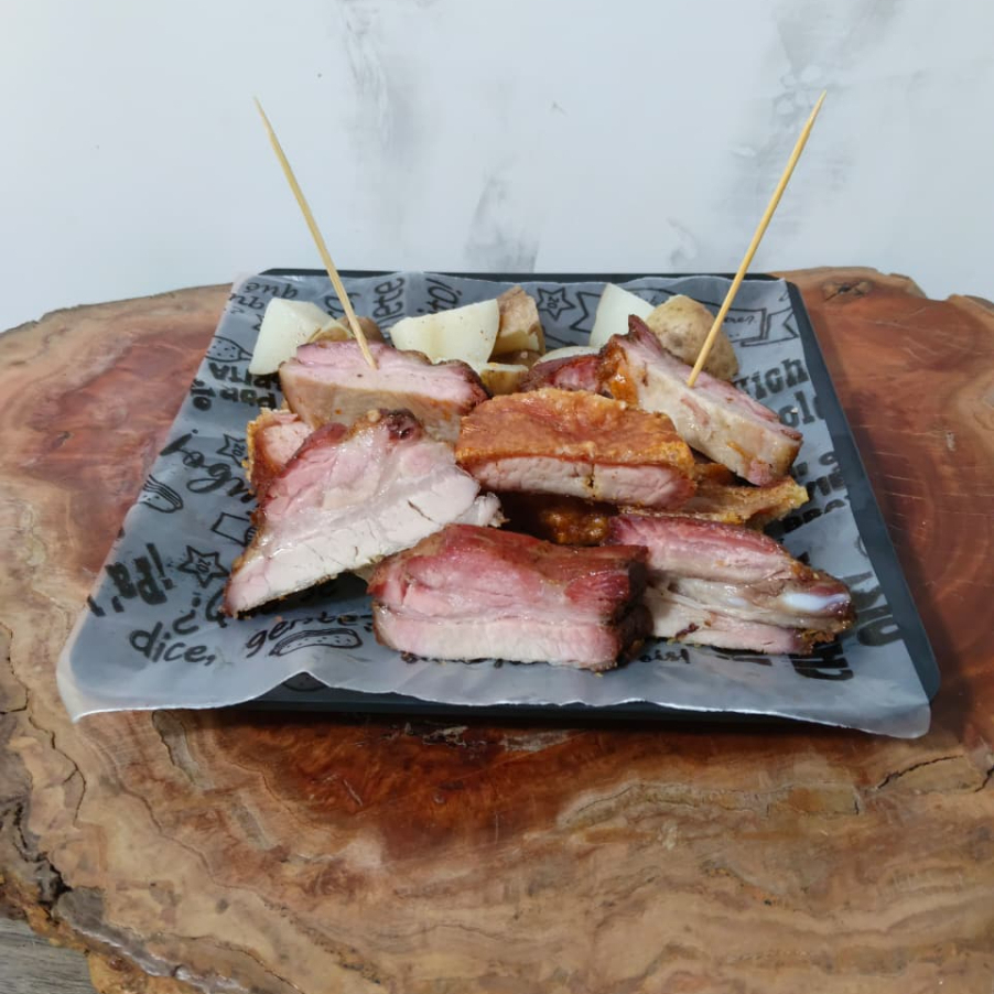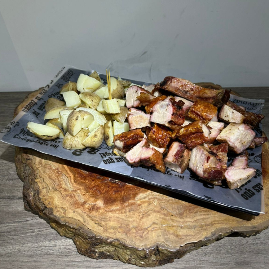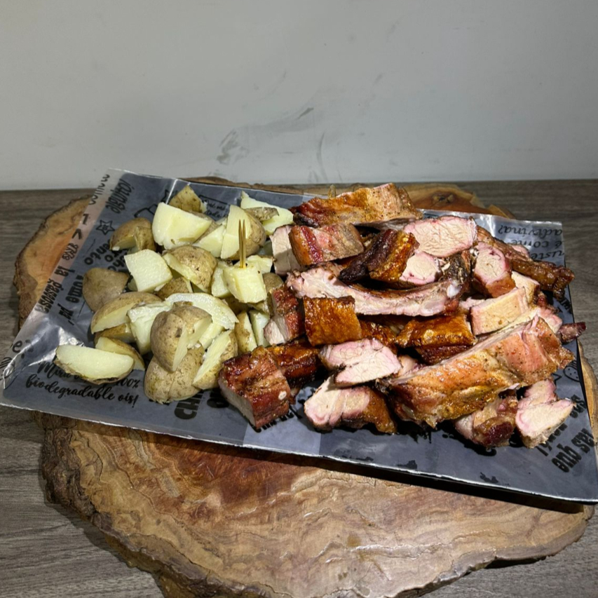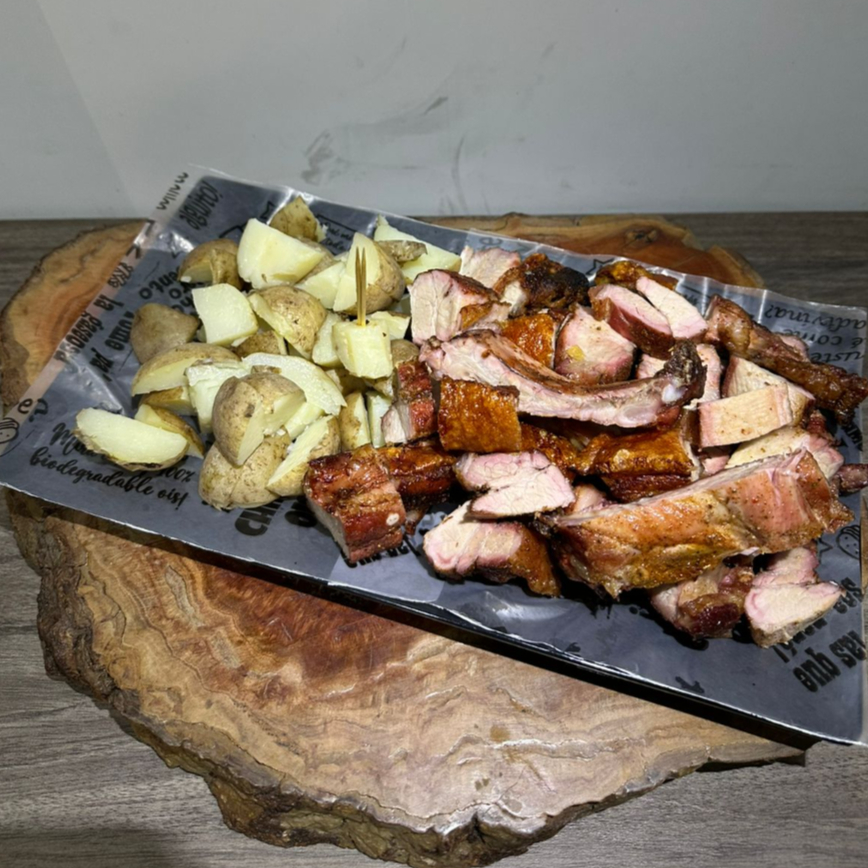 550 g de panceta (chicharrón, costilla y carne pulpa) acompañados por papa cocida.