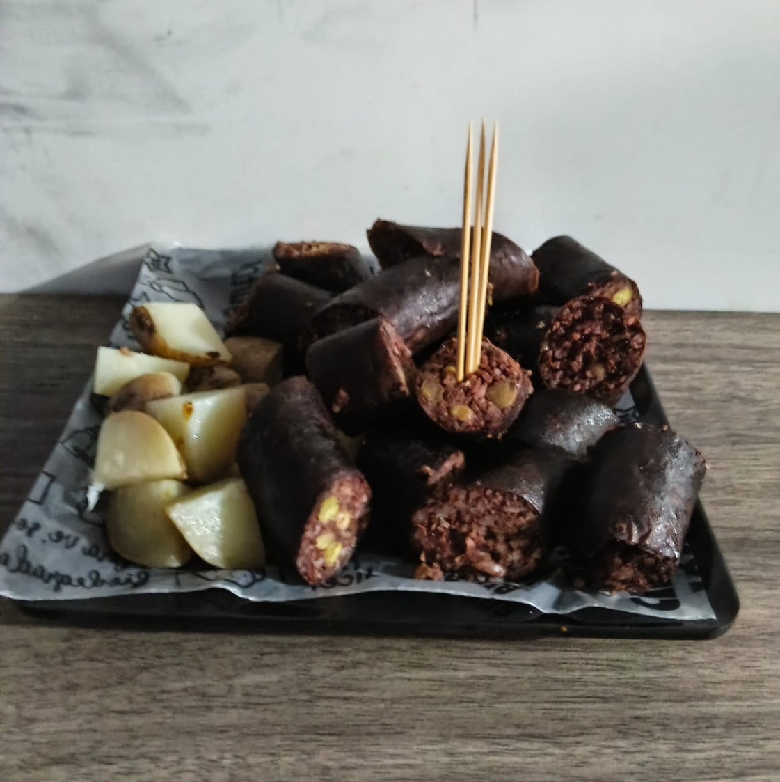 Libra de Rellena ahumada al barril, acompañada de papa cocida