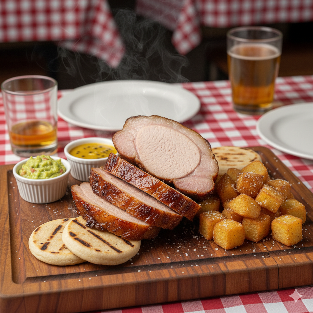 Dúo dorado, bondiola premium, jugosa y ahumada, cocinada lentamente al barril tras horas de marinado en especias artesanales. Cada corte es suave y lleno de sabor. Con papa salada, arepa artesanal y salsas estrella. ¡Un placer irresistible para compartir!.
