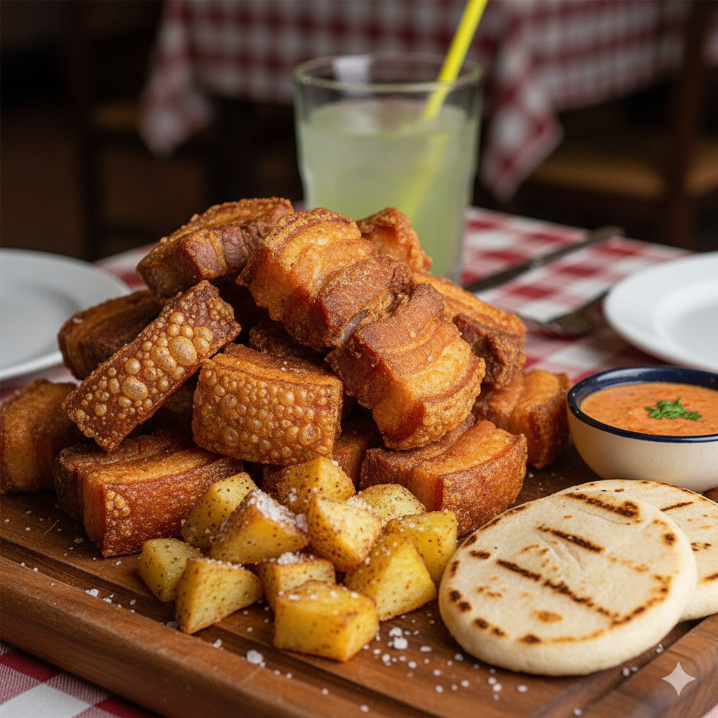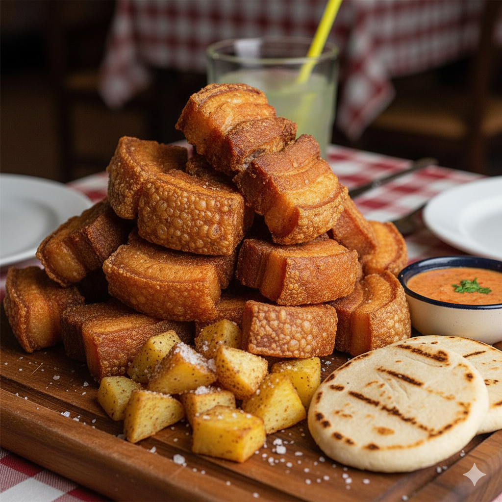 Crujiente tentación barrilera, 300 g de chicharrón dorado, crocante por fuera y jugoso por dentro. Cocinado al fuego lento del barril, acompañado de papa salada, arepa artesanal y salsa cremosa de la casa. ¡Una explosión de sabor 100 artesanal!.
