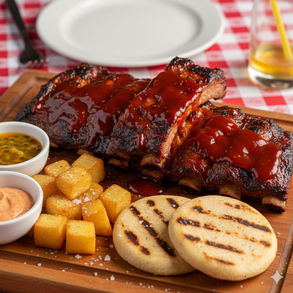 300 g De costilla de cerdo al barril marinada en adobo artesanal y bañada en nuestra salsa BBQ de la casa, dorada, jugosa y con sabor ahumado irresistible. Acompañada de papa salada, arepa artesanal y salsa de maracuyá que elevan cada bocado.