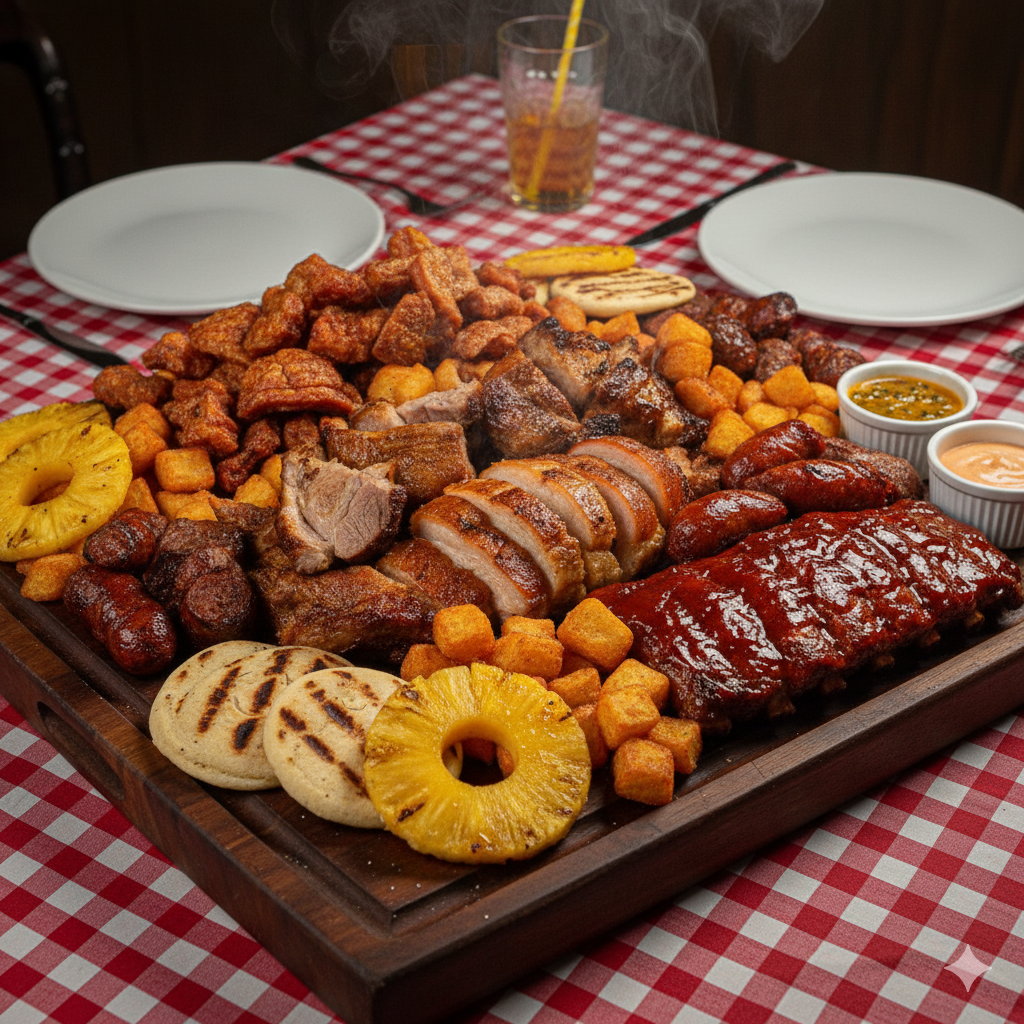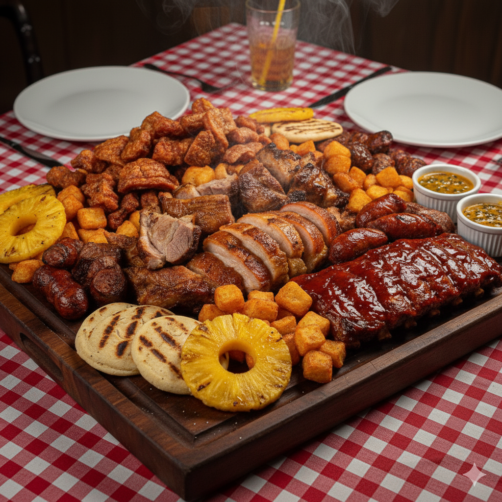 El festín que convierte cualquier reunión en un evento legendario más de 2800 g de pura grandeza: bondiola jugosa, chorizo , porchetta, chicharrón crocante y costilla BBQ en salsa secreta. Con papa salada, arepa, nuestras salsas estrellas.