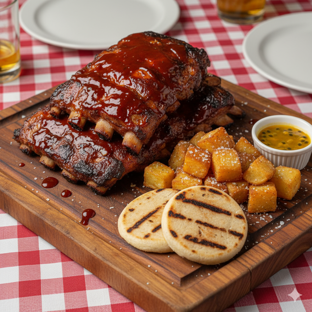 Costillazo del barril, 600 g de costilla de cerdo jugosa, marinada por horas en adobo artesanal y bañada en la salsa BBQ secreta de la casa, dorada, ahumada y suave al paladar. Acompañada de papa salada, arepa artesanal y salsa de maracuyá. ¡Un festín para dos que saben de sabor!.