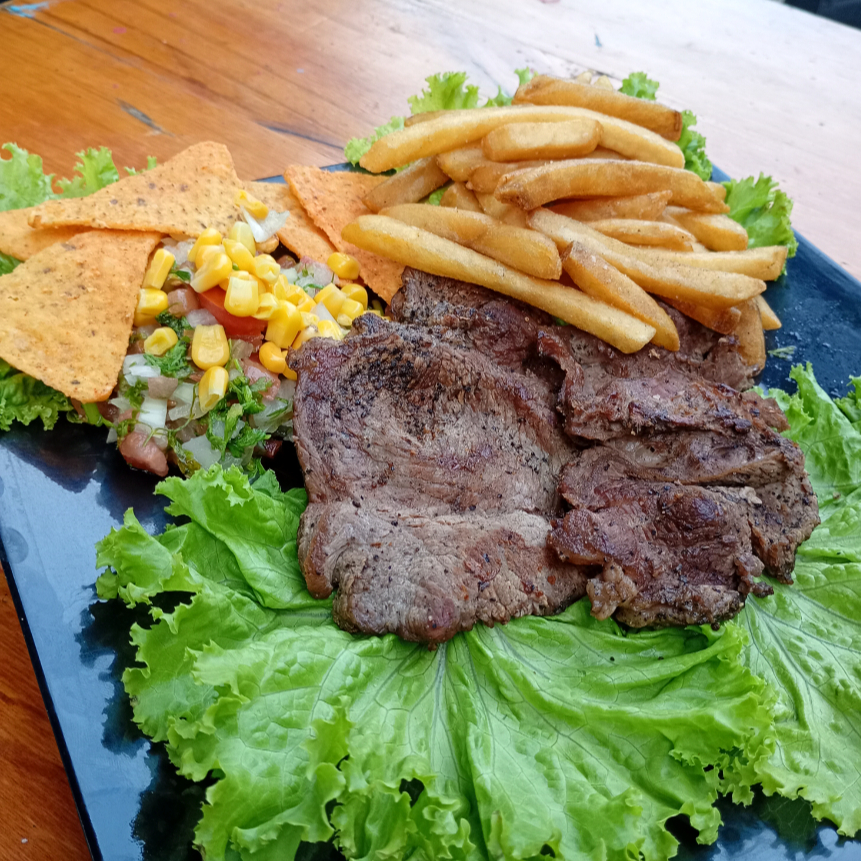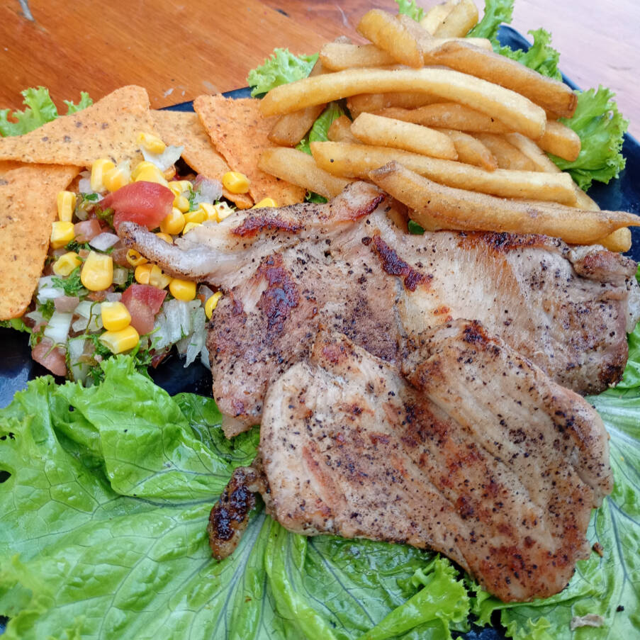 Filete de cerdo de 110 gr, papas a la francesa 50gr, Ensalada salsa de la casa, ají, salsa verde