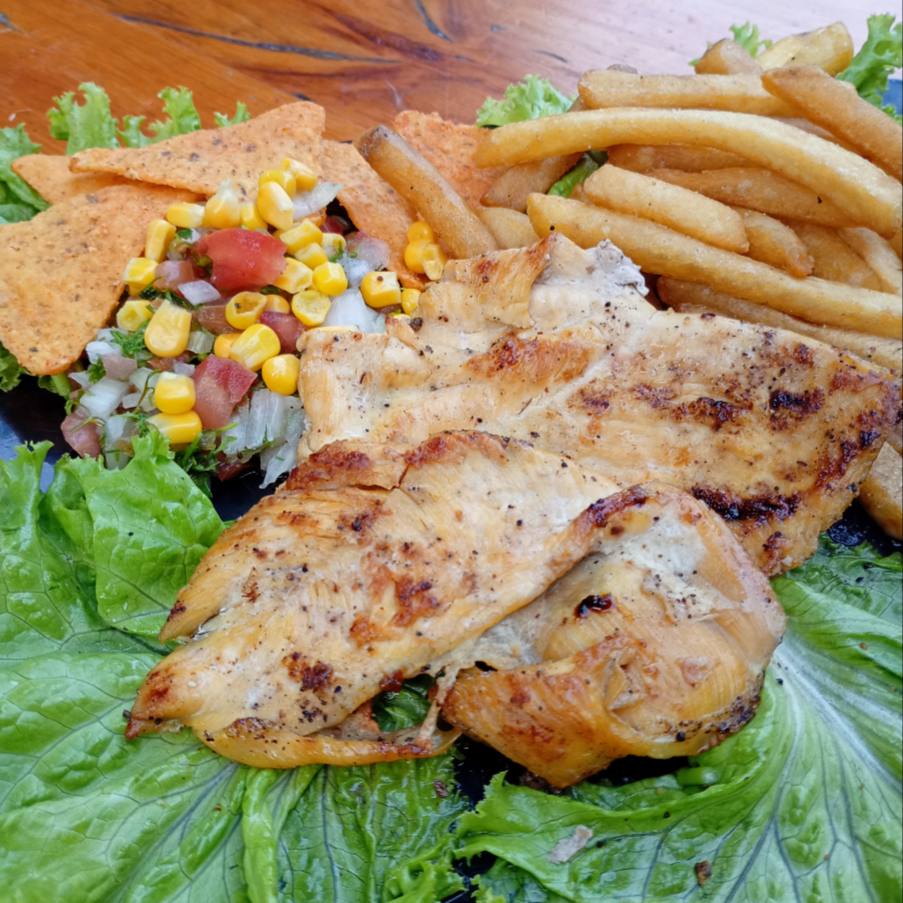 Filete de pollo de 110 Gr, papas a la francesa 50 gr, Ensalada, salsa de la casa , ají, salsa verde