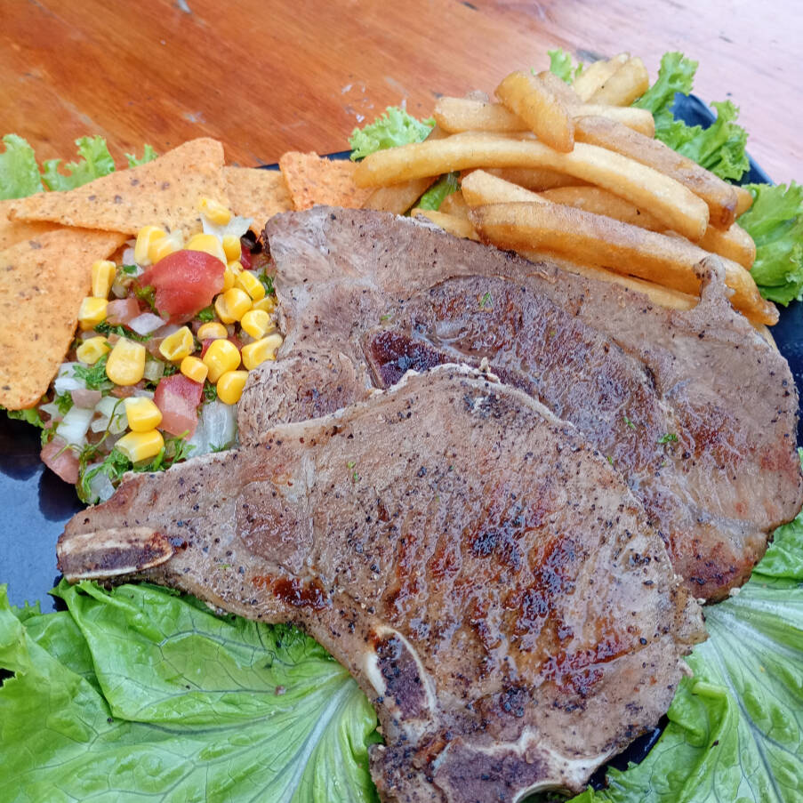 Chuletón de cerdo de 110 gr, papas a la francesa 50gr y ensalada, salsas de la casa