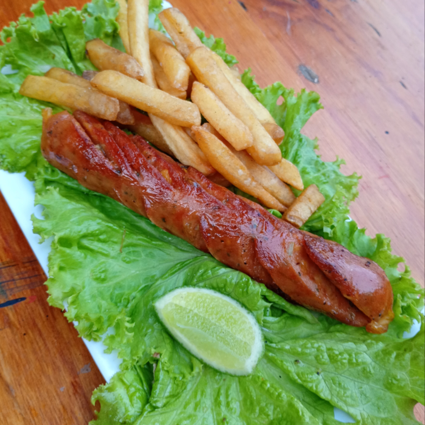 Chorizo con papas a la francesa , salsa de la casa y limón