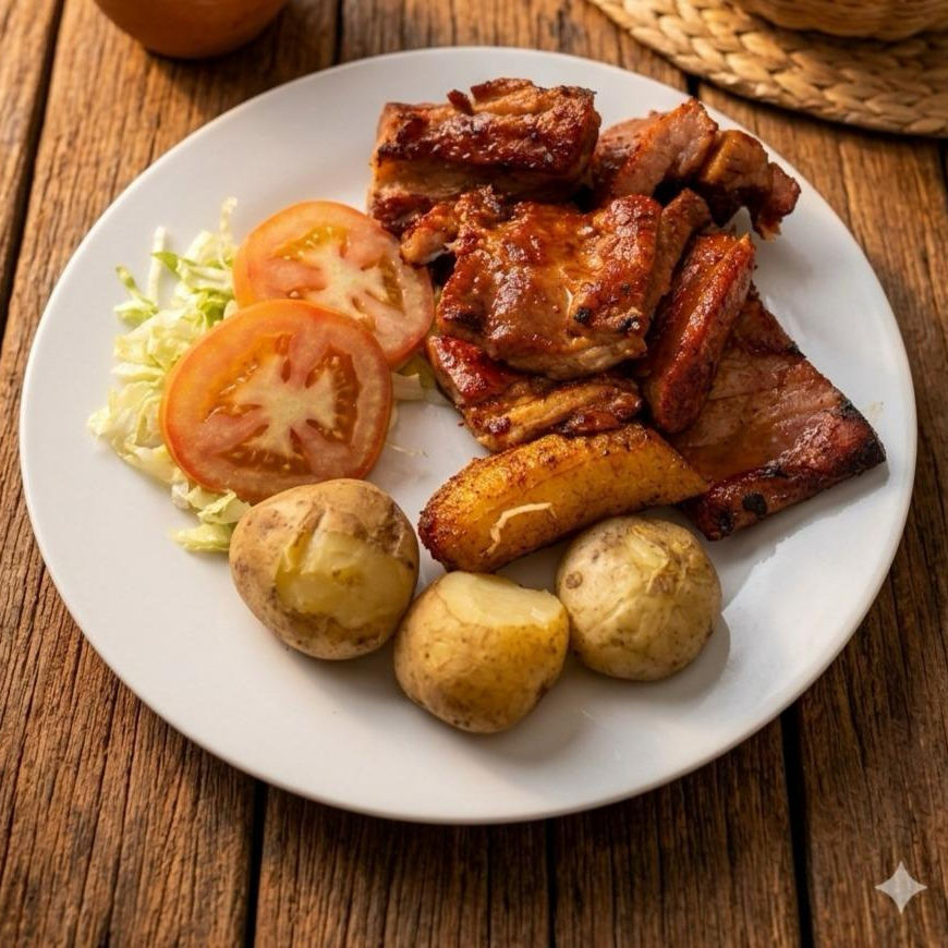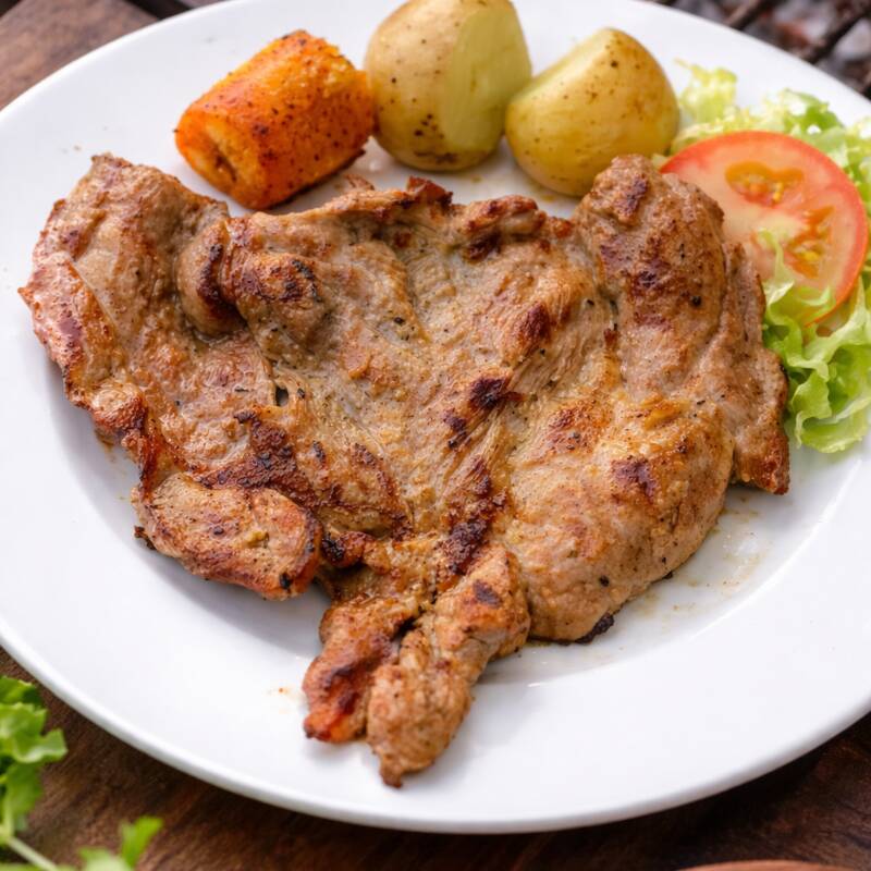 Carne de cerdo magra asada al carbón, acompañada de papa cocida, maduro y ensalada