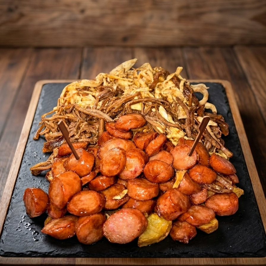 Salchicha llanera rica, papa a la francesa, papa amarilla, carne desmechada de res, pollo desmechado, tocineta