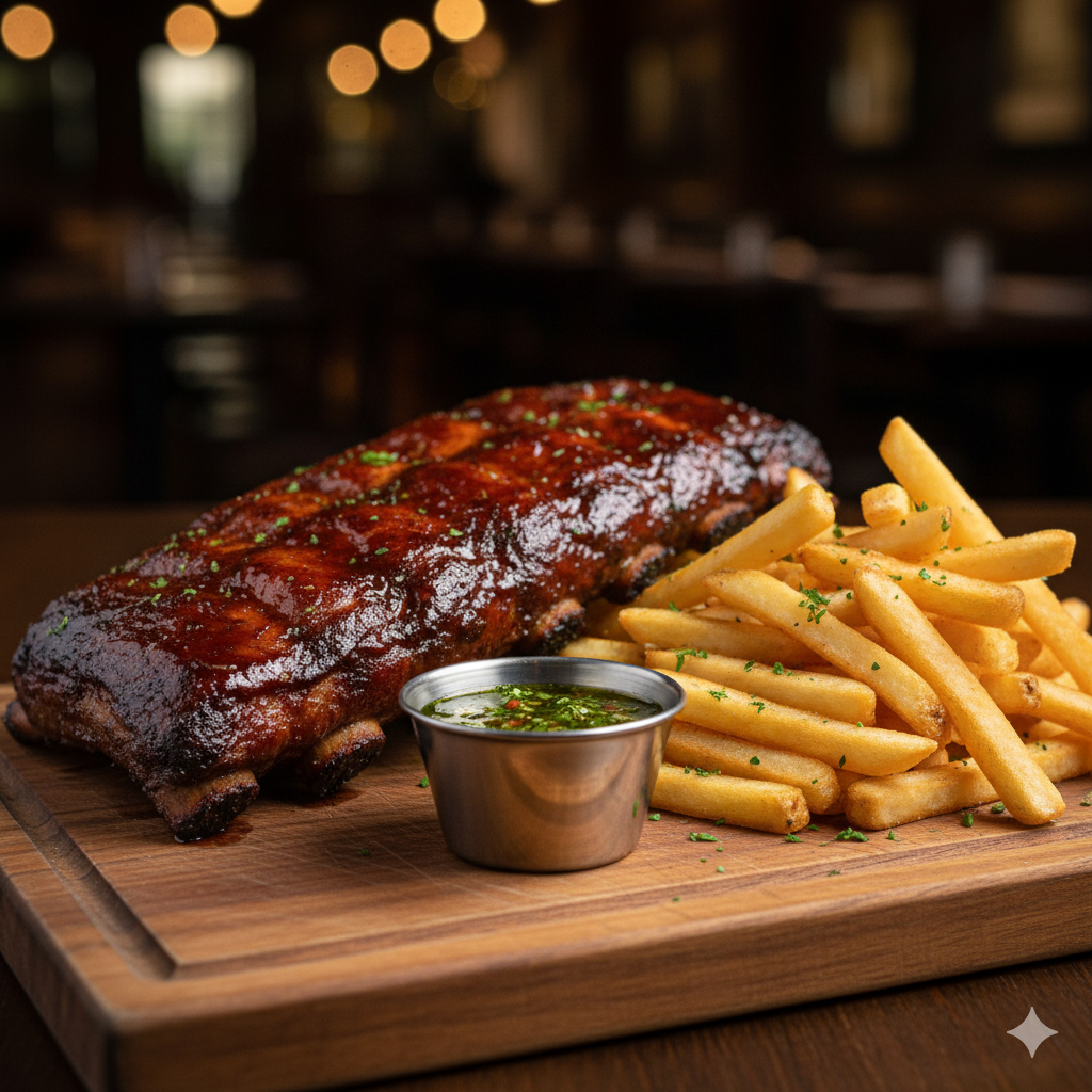 Costillas a la BBQ acompañadas de papas a la francesa y chimichurri