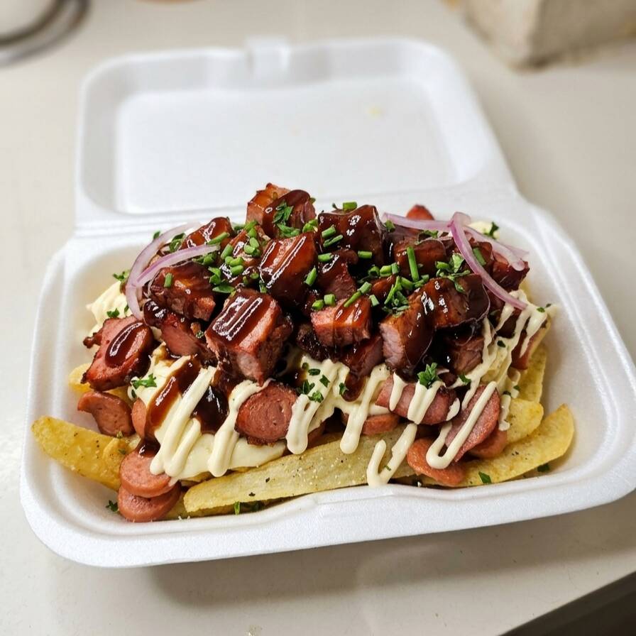 deliciosa salchipapa con ripio y costilla ahumada a la bbq y queso