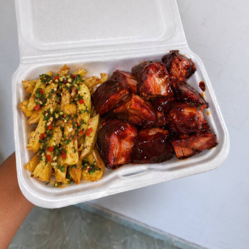 Porcion personal: Costilla ahumada acompañada de papa a la francesa y delicioso chimichurri.