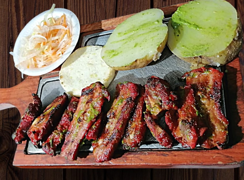 400 g Costilla a la brasa, papas y ensalada de la casa.