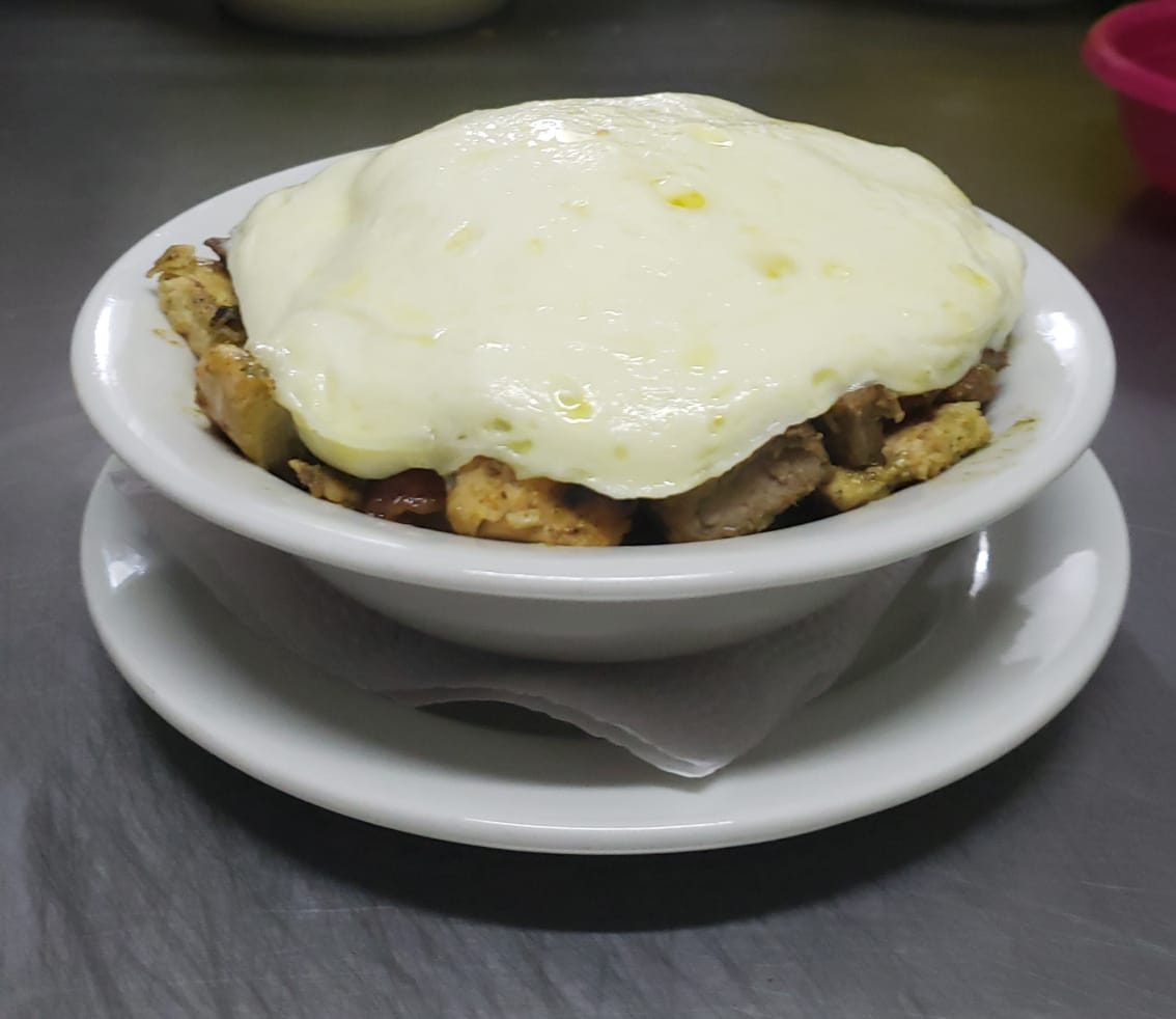 Carne de pollo, carne de res, chicharron, queso, y huevo de codorniz.
