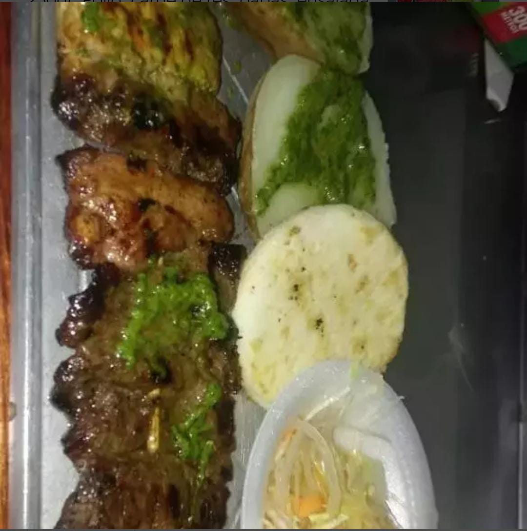 260 g (carne de res, pollo y costilla) papa salada, ensalada de la casa y arepa.