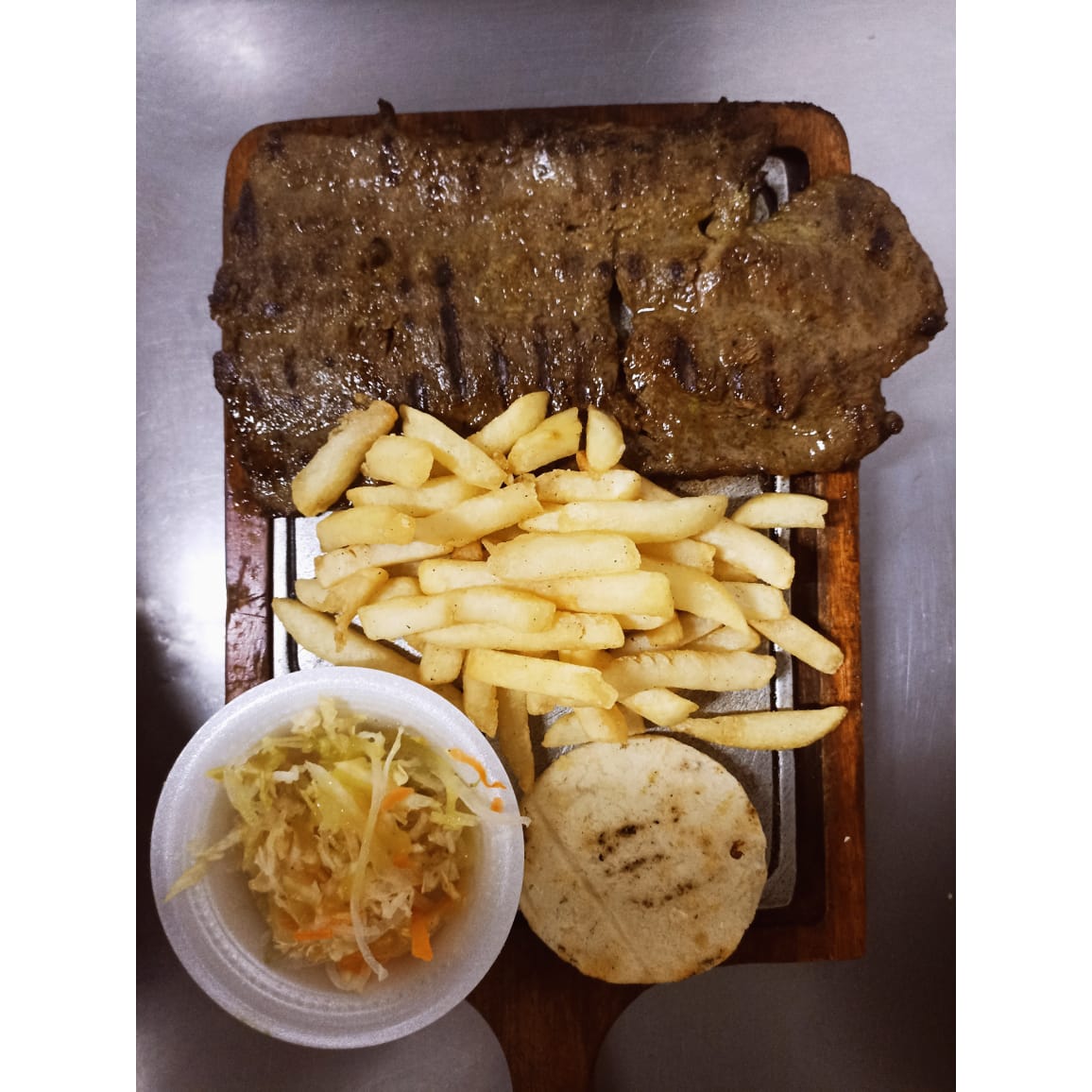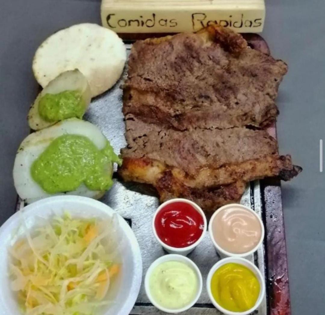 250 g de carne de res, papas, ensalada de la casa y arepa.