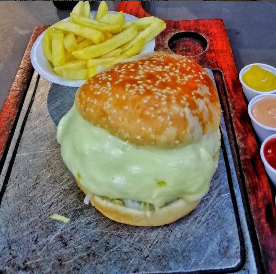 Carne de res, tomate, queso, cebolla, tocineta y ripio.