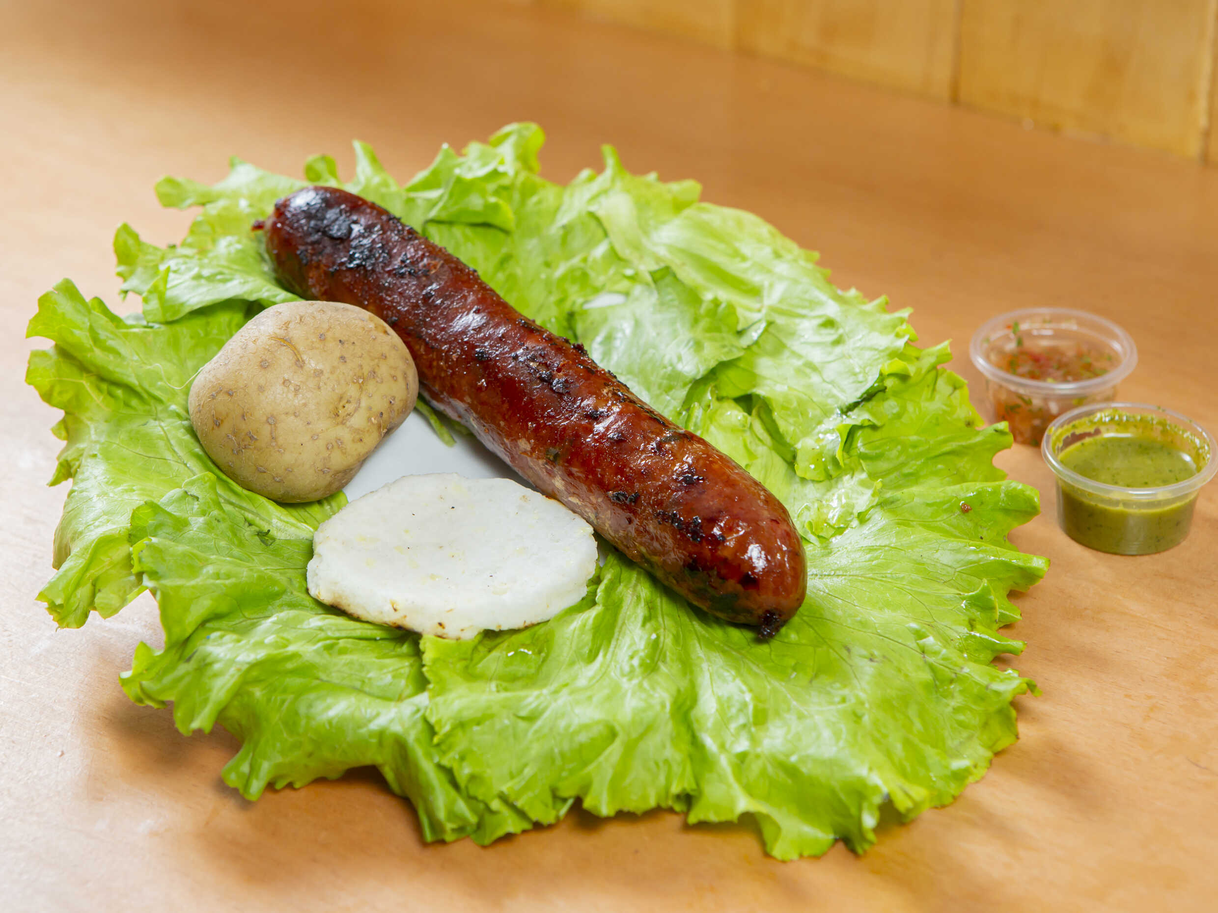 Chorizo santarosano, papa, arepa, chimichurri y bebida 250 ml.