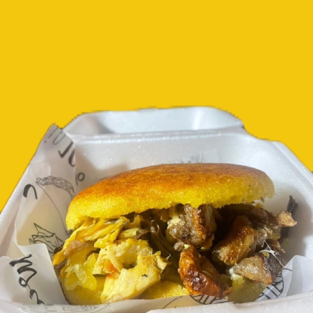 AREPA DE CHOCLO, CARNE DESMECHADA, POLLO DESMECHADO Y CHICHARRON