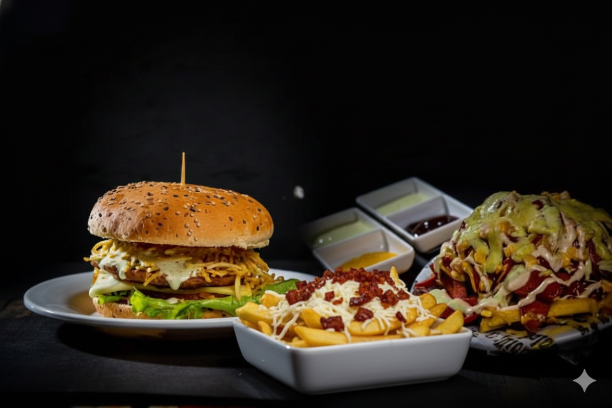 Hamburguesa Tradicional (Pan artesanal, carne artesanal, papa ripio, salsas de la casa, lechuga, tomate y queso) + Salchipapa Jr + Papas a la francesa con Tocineta y queso rallado.