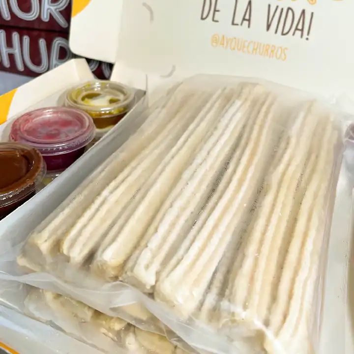 Caja de 50 mini churros congelados para preparar en casa, acompañados de 6 salsas a tu elección.