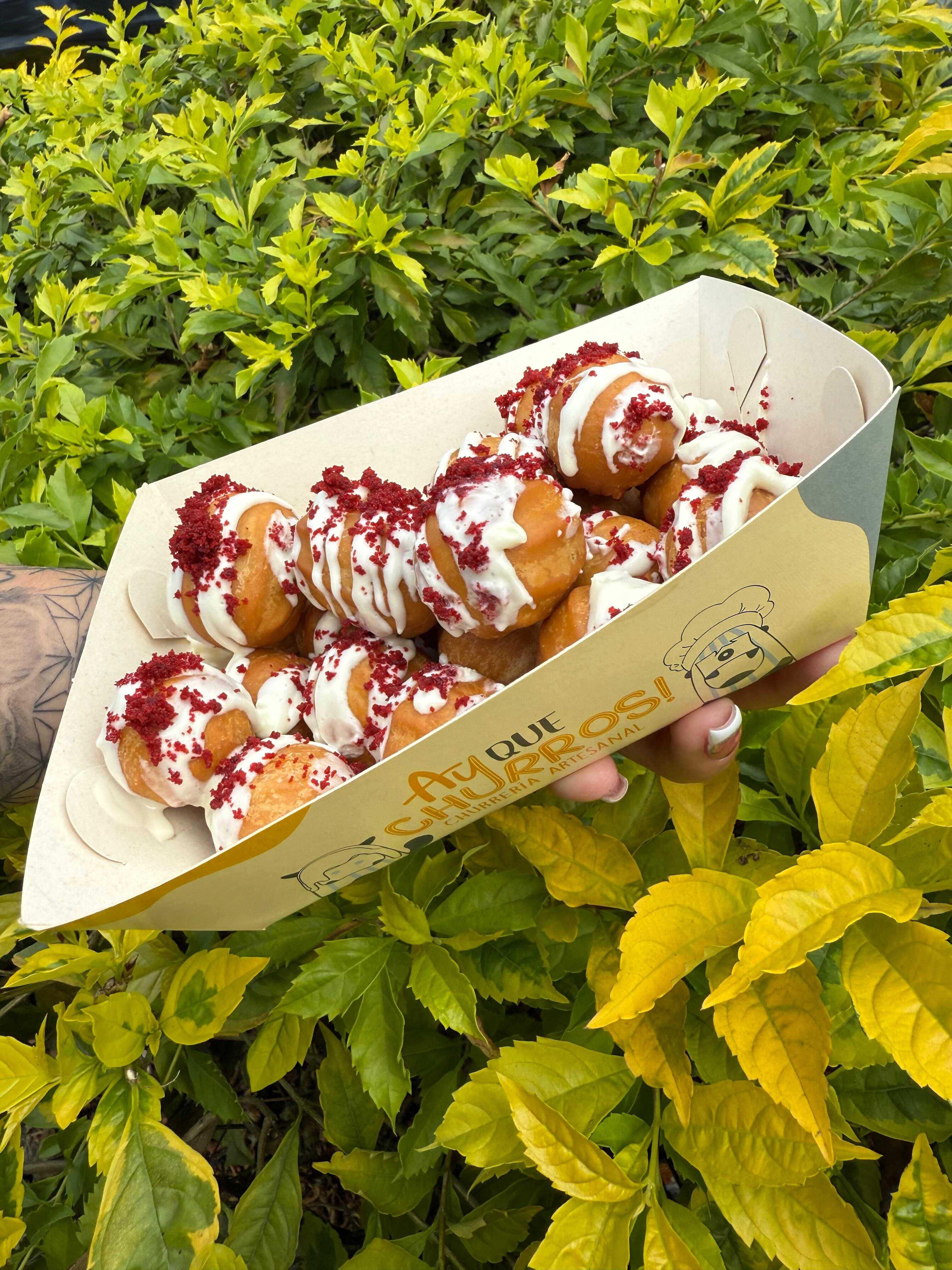 Caja de 6 churros rellenos con chocolate dulce y crema de queso red velvet. Decorados con chantilly , trocitos de torta y galletas oreo edición navidad.
