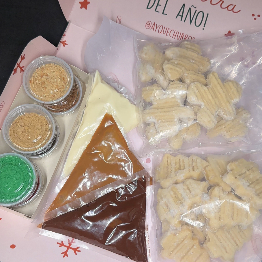 Kit navideño para preparar y decorar tus churros en casa, trae: 14 churros en forma de arbolitos y galletas de jengibre🎄🥨 acompañados de toppings y salsas para decorar como mas te guste.