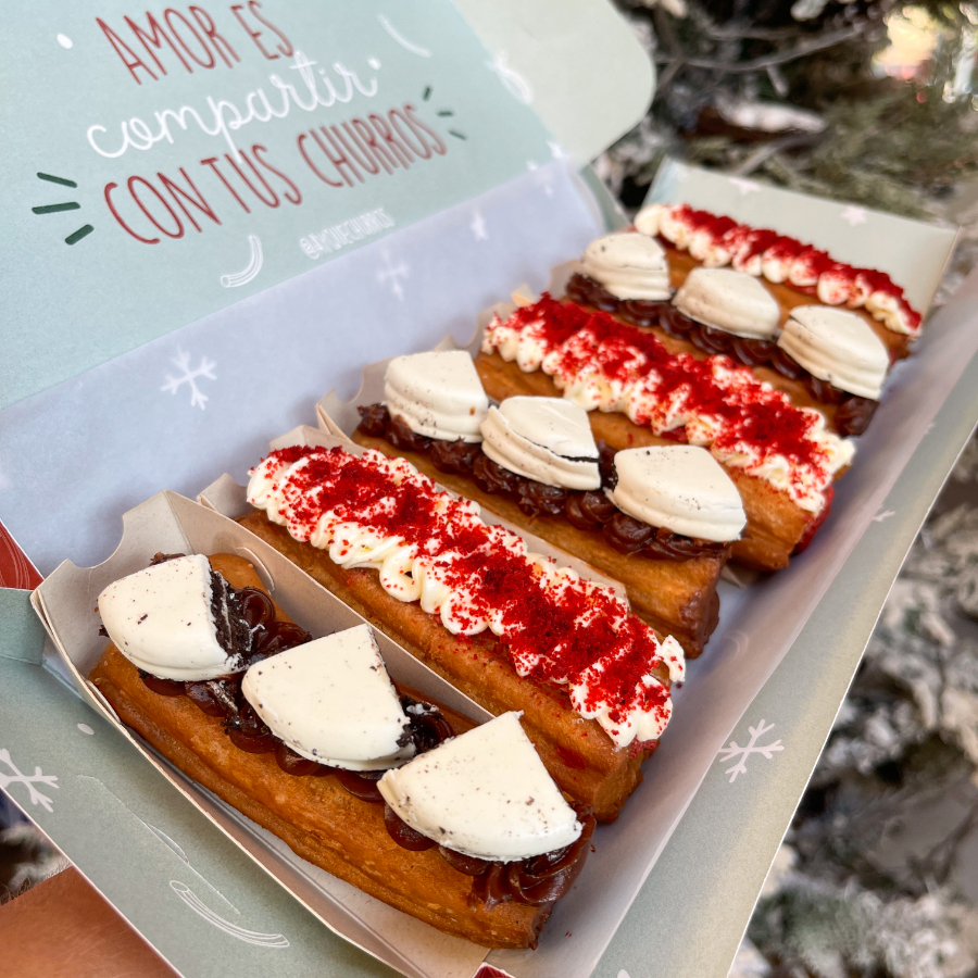 Caja de 6 churros rellenos con chocolate dulce y crema de queso red velvet. Decorados con chantilly , trocitos de torta y galletas oreo edición navidad.