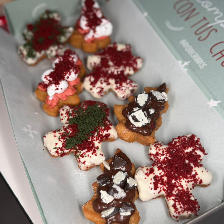 Caja de 8 churros en forma de Arbolito y Galletica de jengibre acompañado con Oreo navideña, frosting red velvet, butter cookies, y green velvet