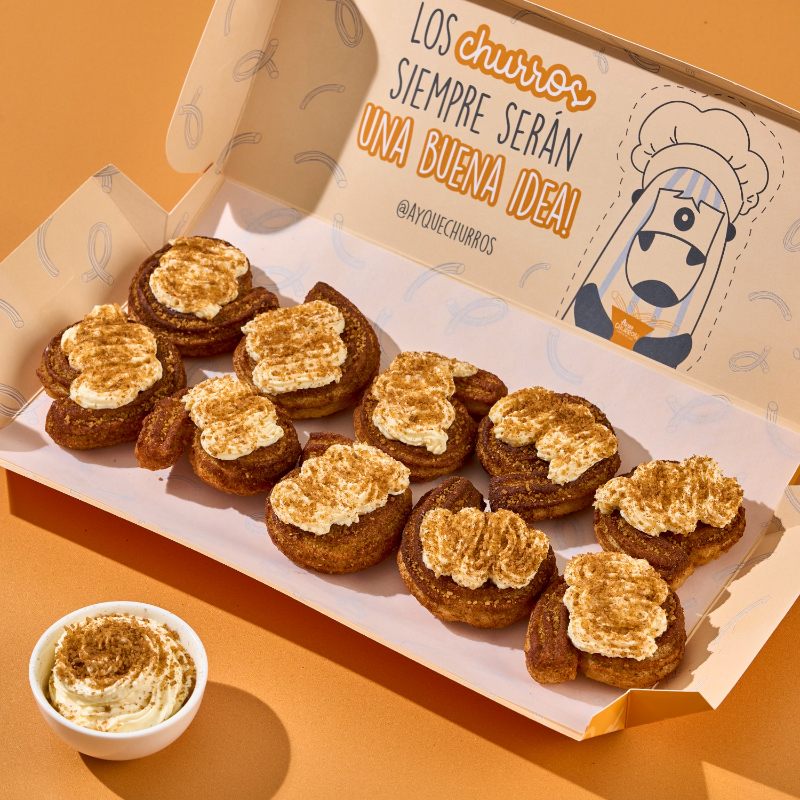 Caja de 10 churros en forma de espiral con sabor a canela y glaseado de queso, la combinación perfecta que no puedes dejar de probar.