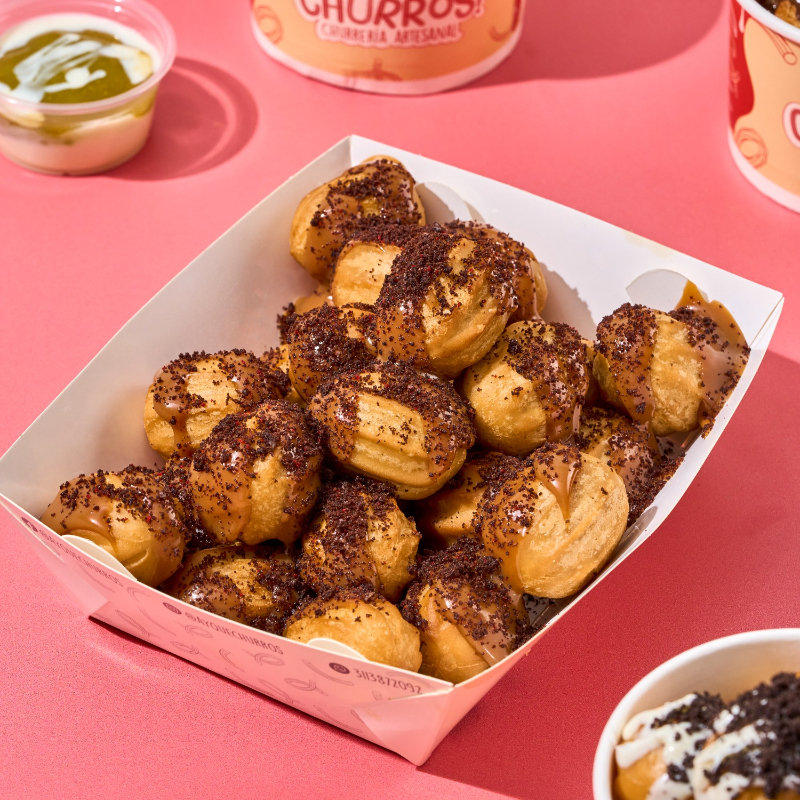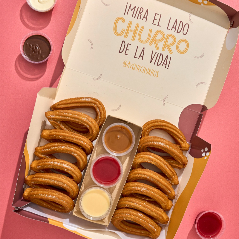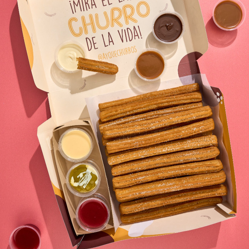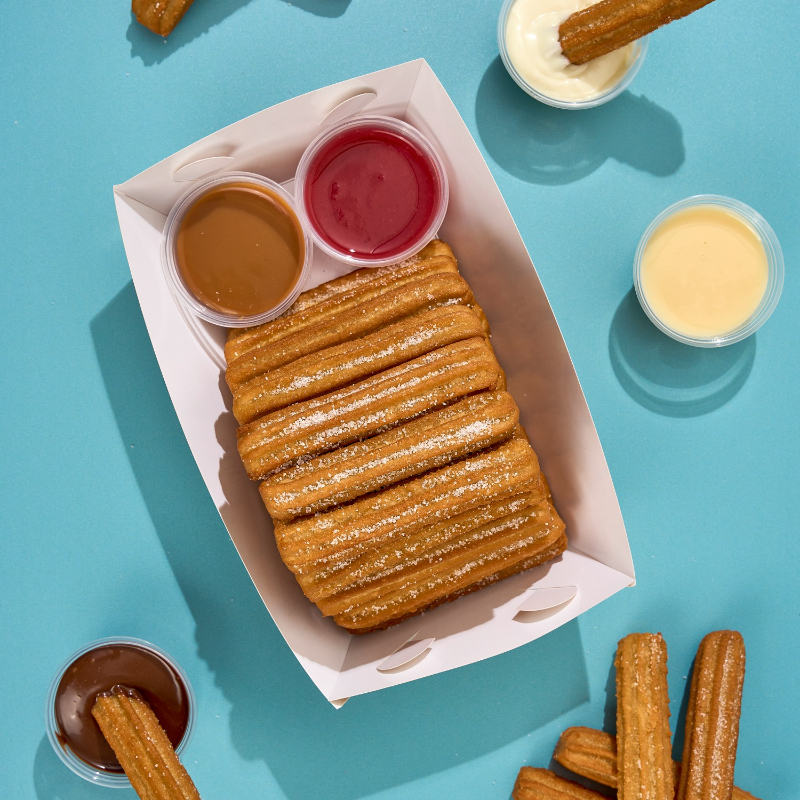 Caja de 25 mini churros acompañados de 3 salsas para disfrutar con tus personas favoritas.