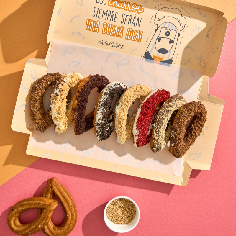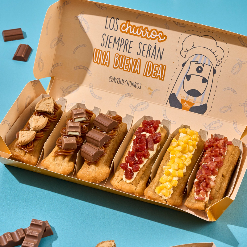 Caja de 6 churros rellenos 3 dulces y 3 salados, el balance perfecto hecho churro.