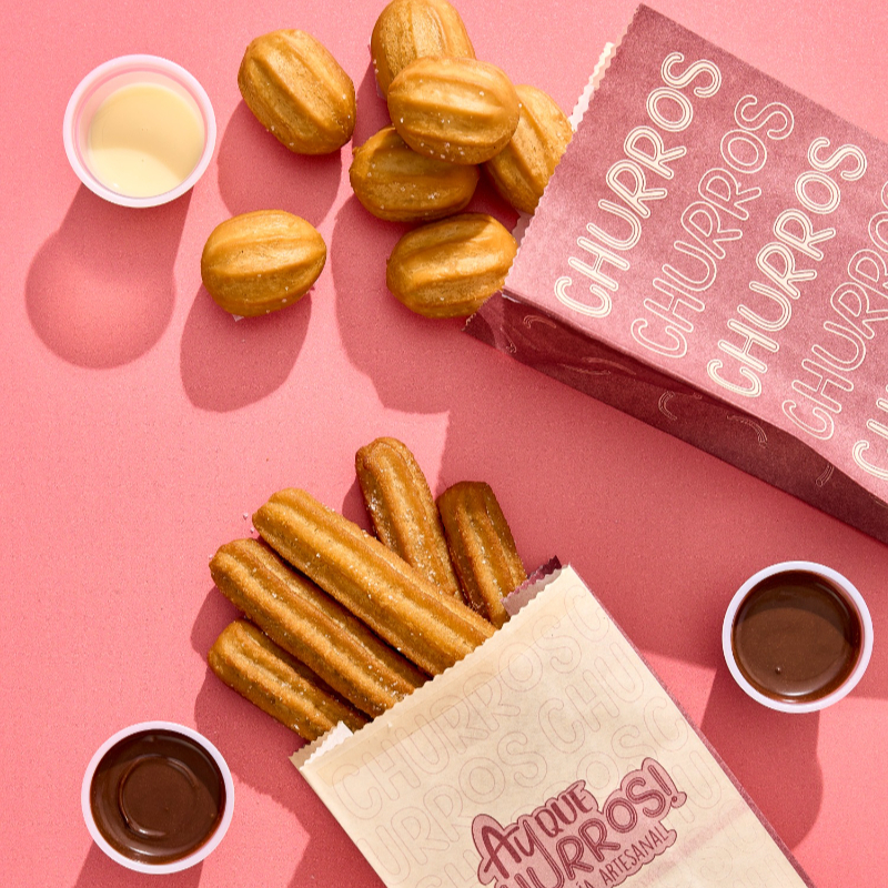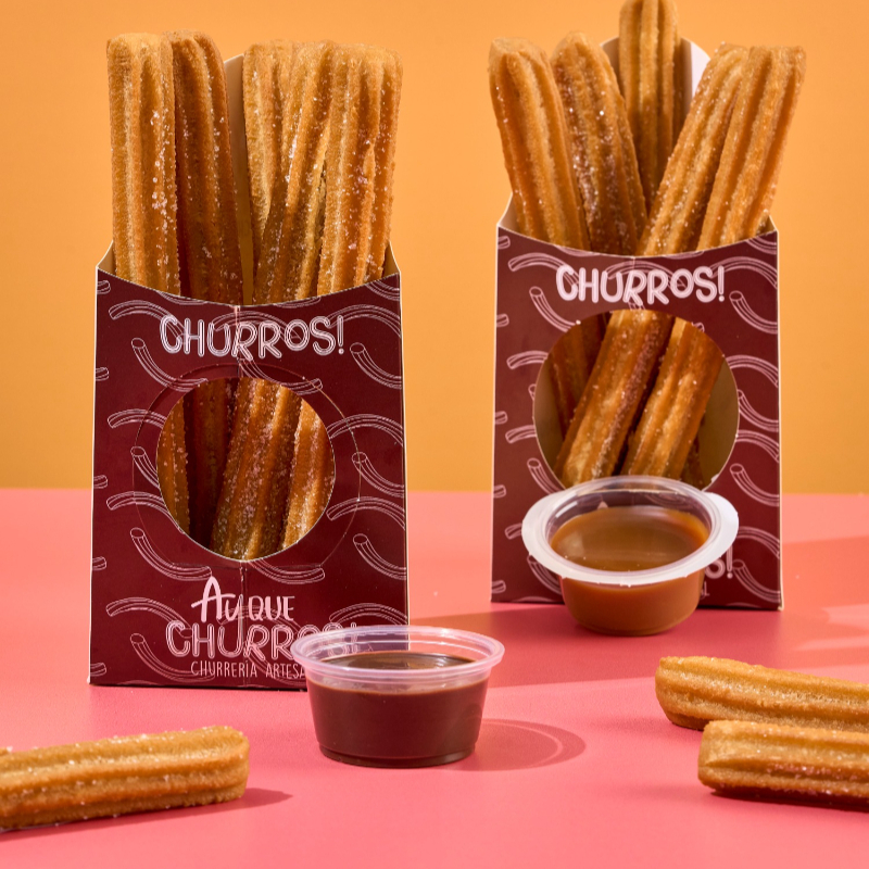 30 Churros tradicionales de 20 cm, crujientes y listos, vienen con 6 salsas para que nadie se quede con las ganas de elegir su favorita.
