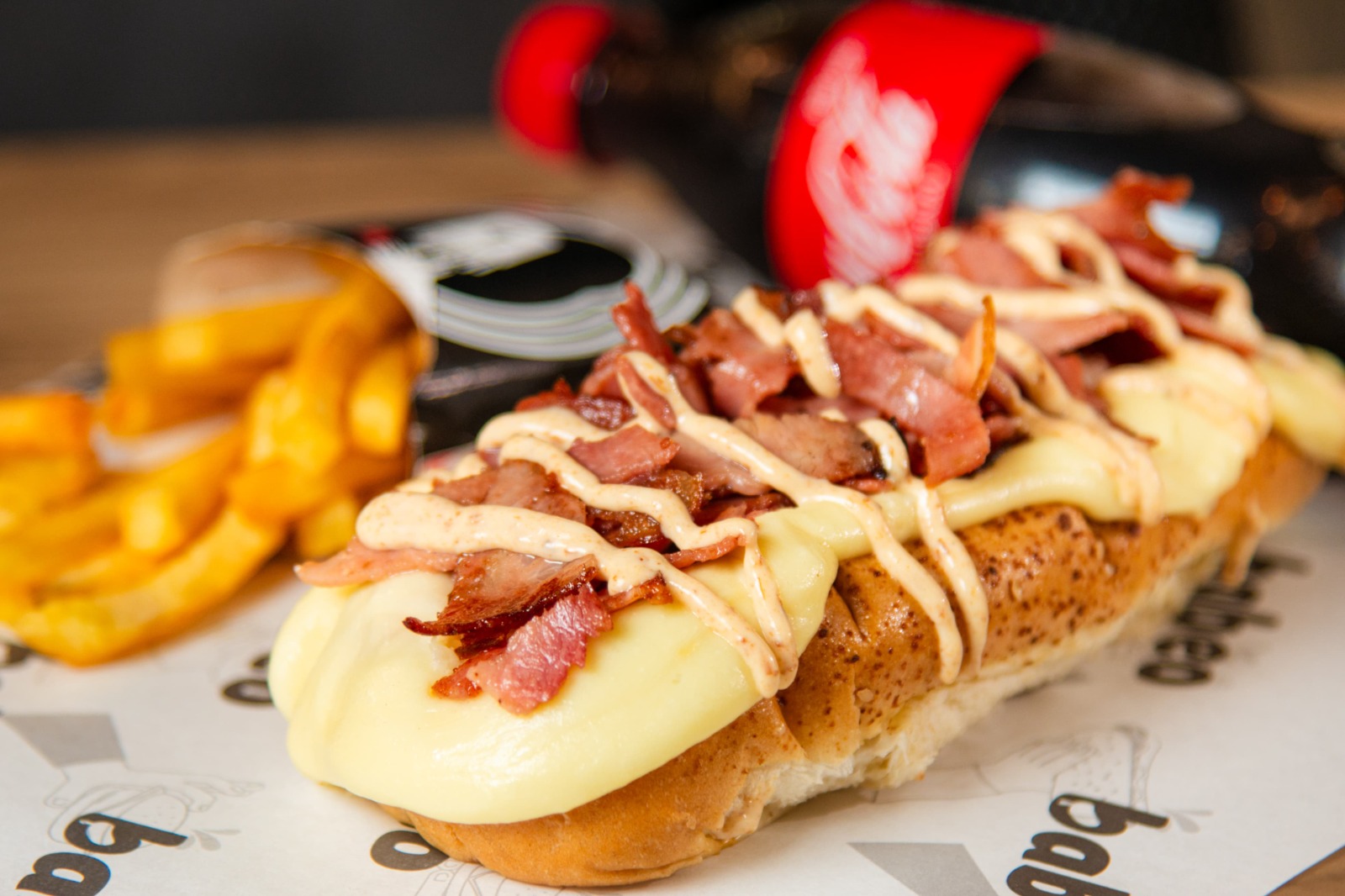 Pan artesanal, Salchicha Americana, Salsa de tocineta, Queso mozzarella, Ripio, Tocineta y cebolla.