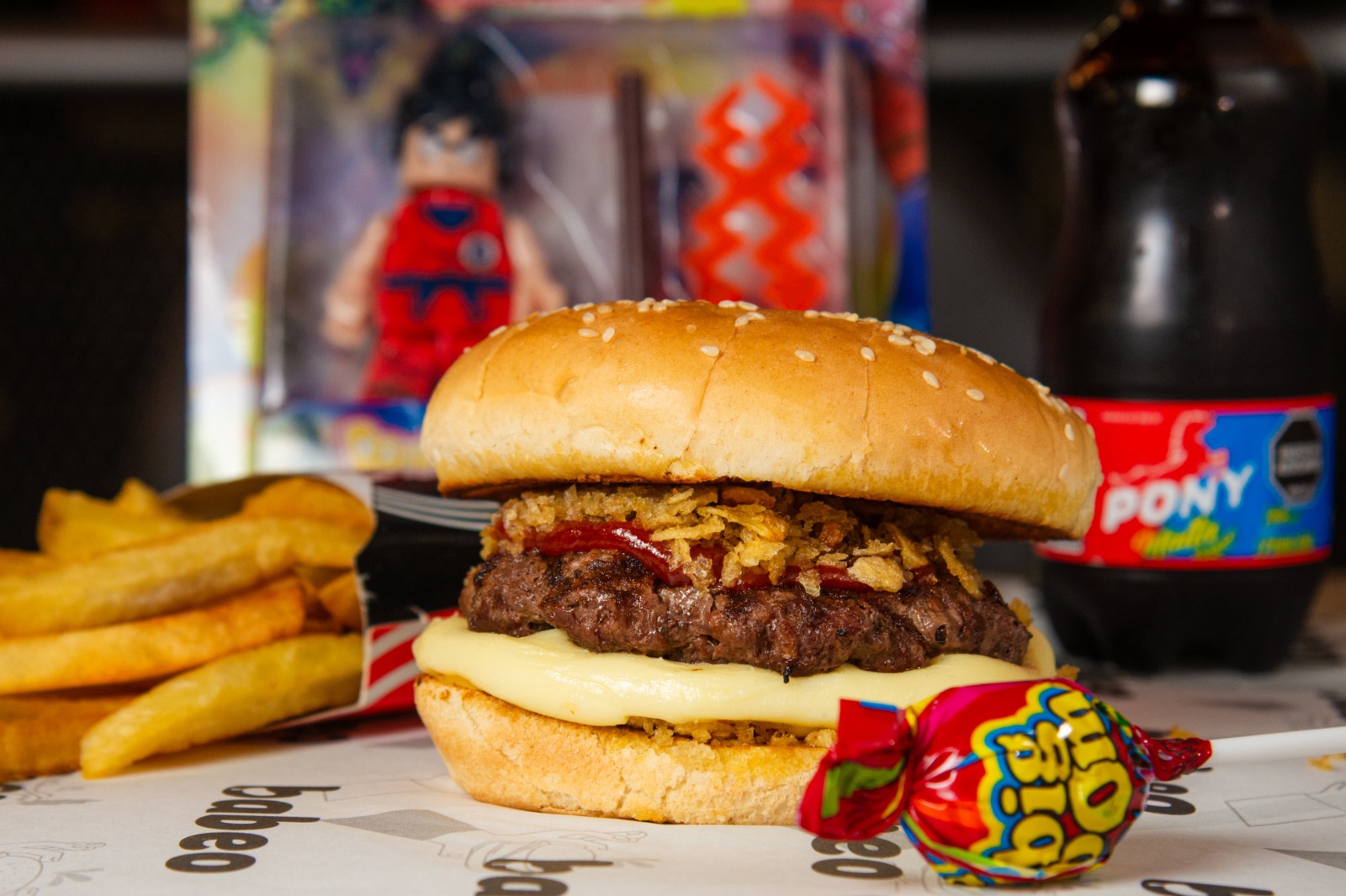 Elige entre una mini burger o un mini perro, acompañado de papas, Coca Cola 250 ml, bombón y juguete (elegir para niño o niña).