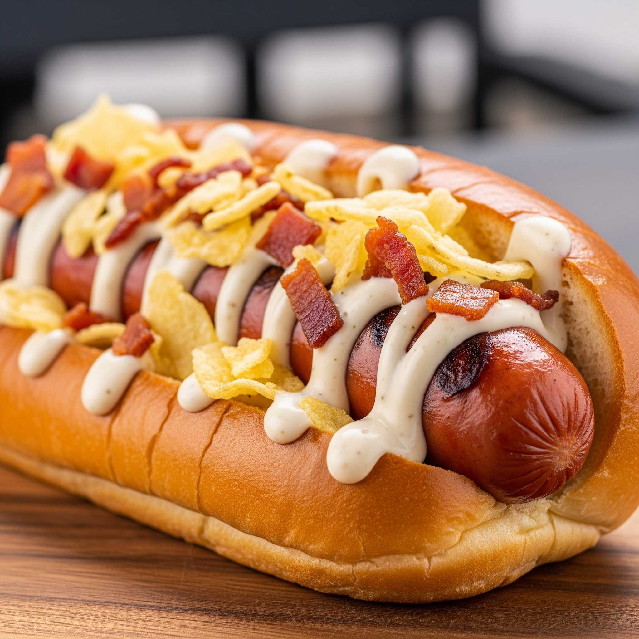 Pan brioche, salchicha americana, salsa de tocineta, queso, ripio.