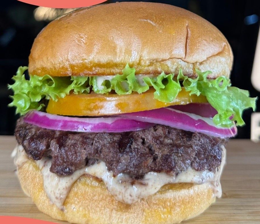 Pan artesanal, carne angus, salsa de tocineta, lechuga, tomate, cebolla morada, queso mozzarella.