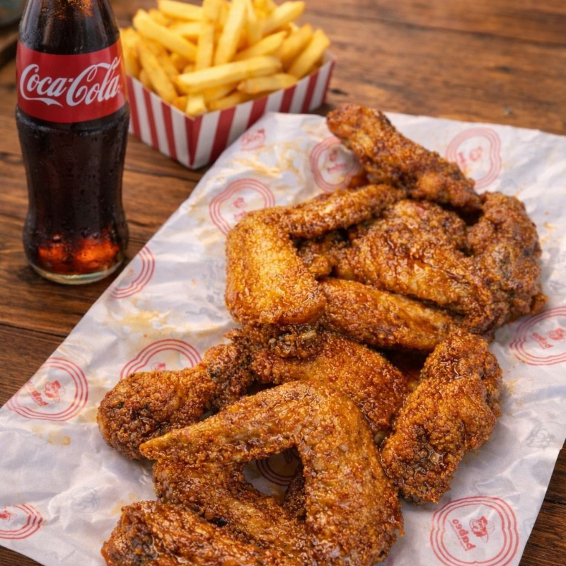 6 deliciosas alitas apanadas, bañadas en salsa BBQ, acompañadas de papas a la francesa y CocaCola 400Ml