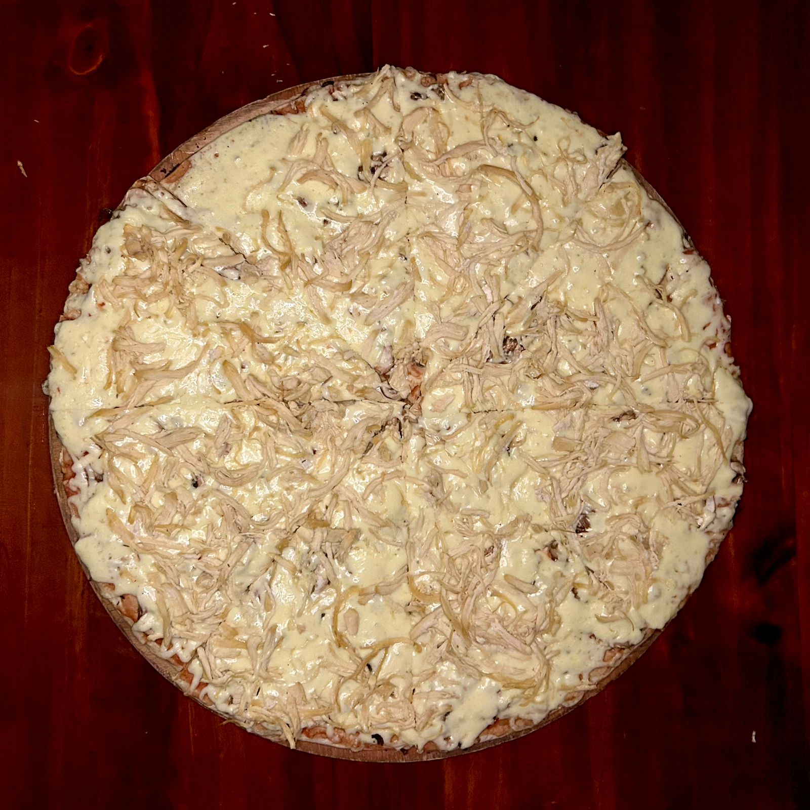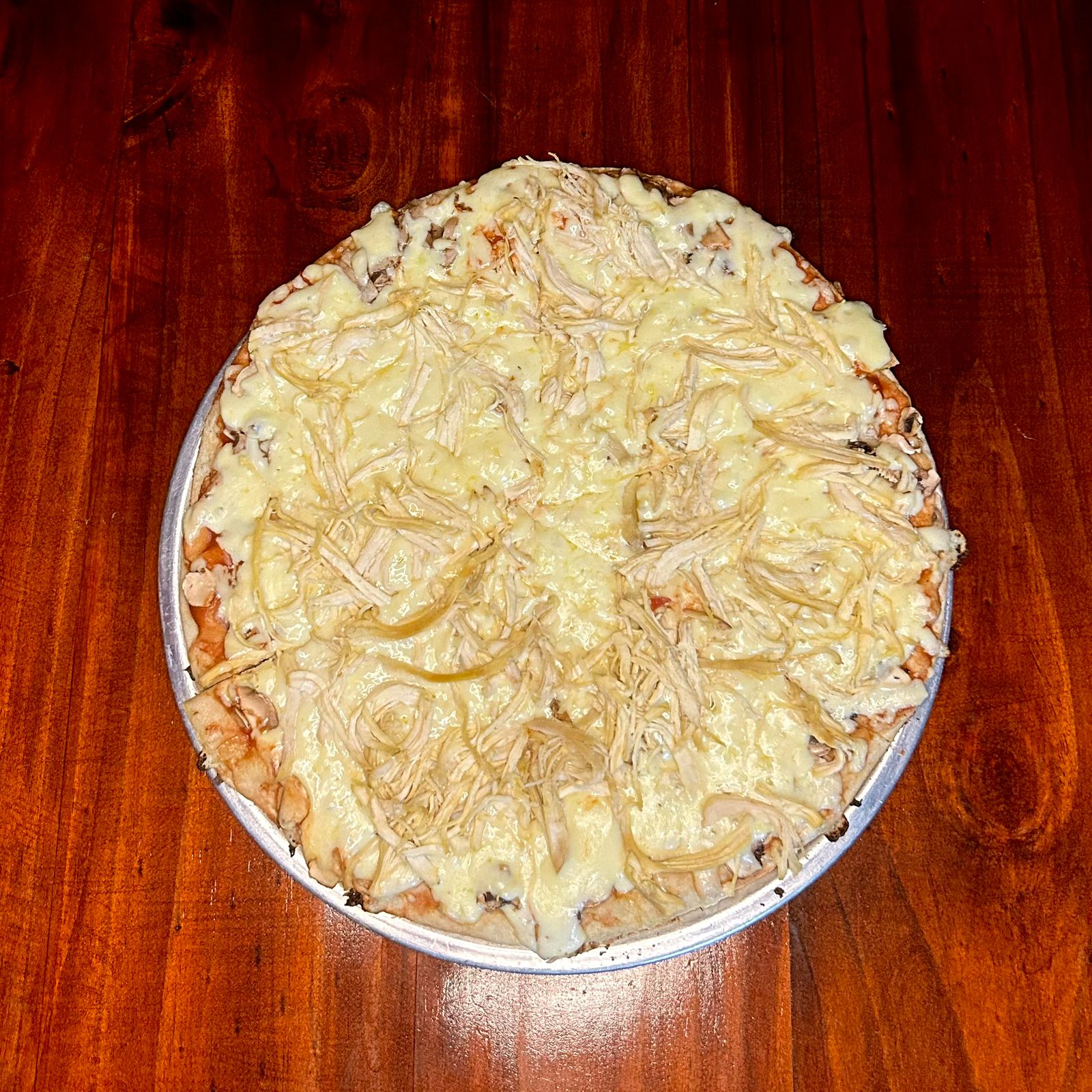 Pizza de 45 cm con una combinación de pasta de tomate, pollo, champiñon y abundante queso sobre nuestra masa artesanal 8 porciones aprox.