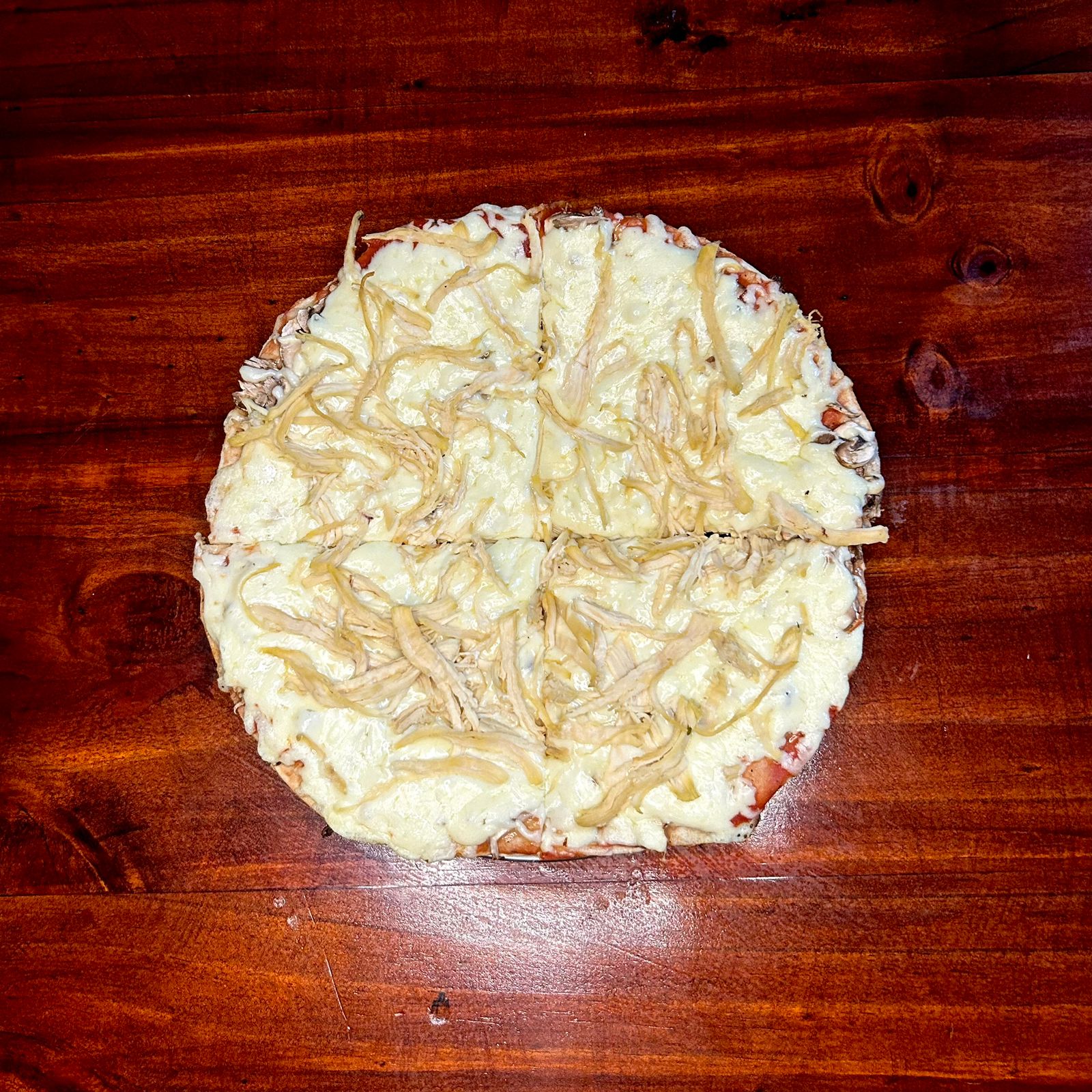 Pizza de 22 cm con una combinación de pasta de tomate, pollo, champiñon y abundante queso sobre nuestra masa artesanal 4 porciones aprox.