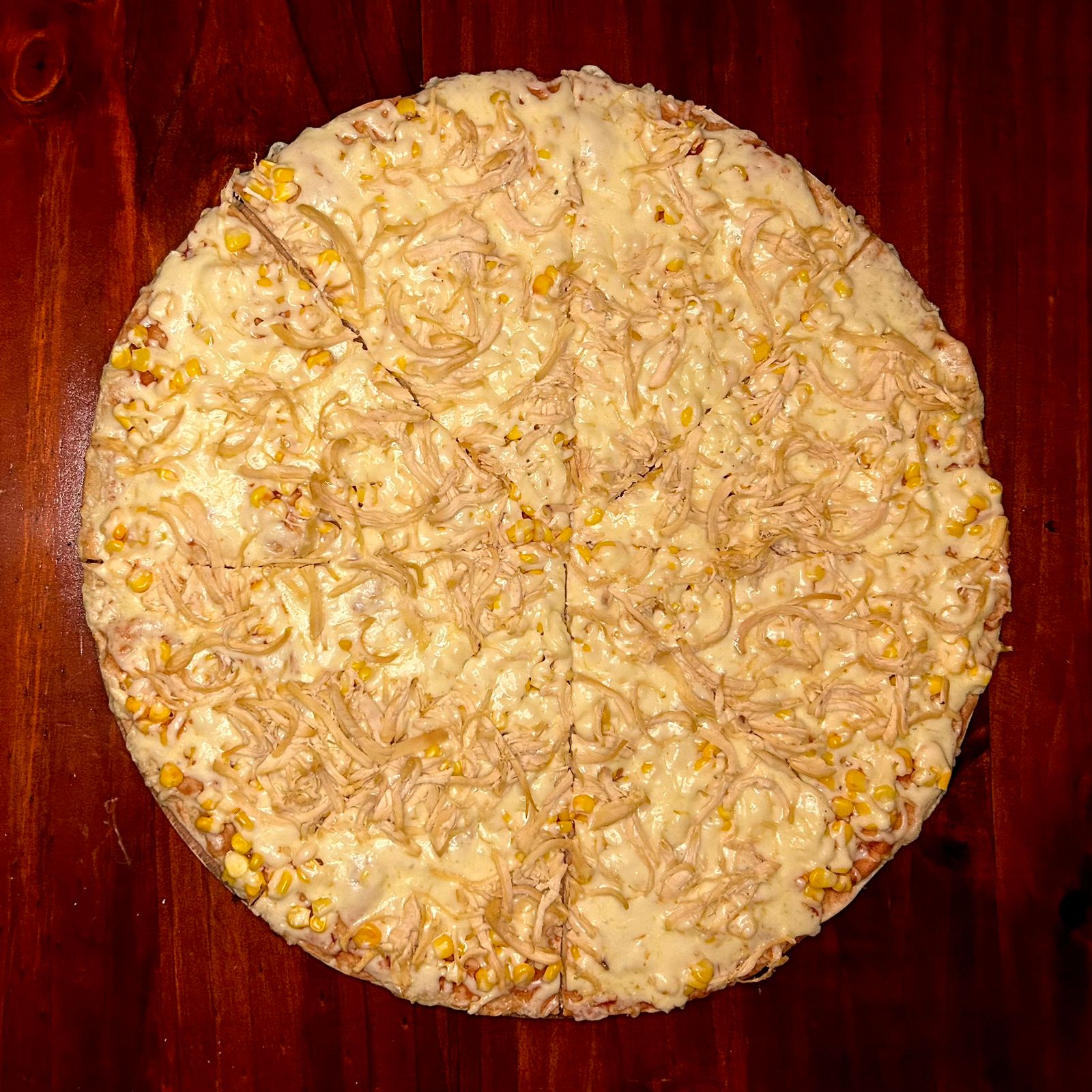Pizza de 45 cm con una combinación de pasta de tomate, pollo, maíz y abundante queso sobre nuestra masa artesanal 8 porciones aprox.