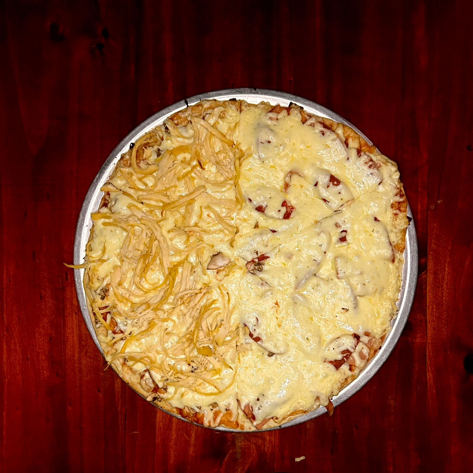 Pizza de 45 cm con una combinación de pasta de tomate, jamón, pollo y abundante queso sobre nuestra masa artesanal 8 porciones aprox.