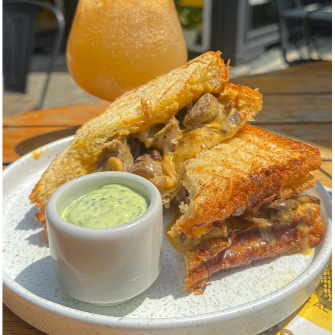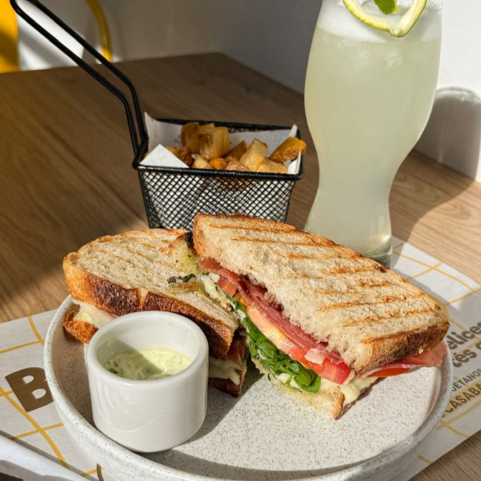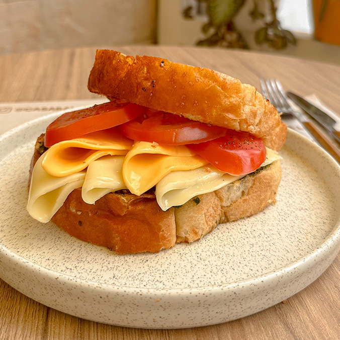 Sándwich con pan brioche artesanal de pesto, quesos fundidos de temporada y tomate.