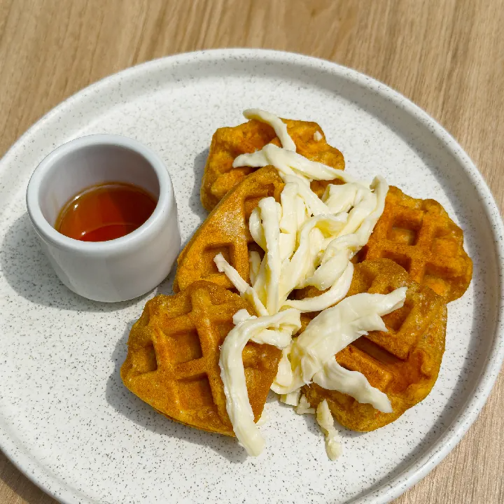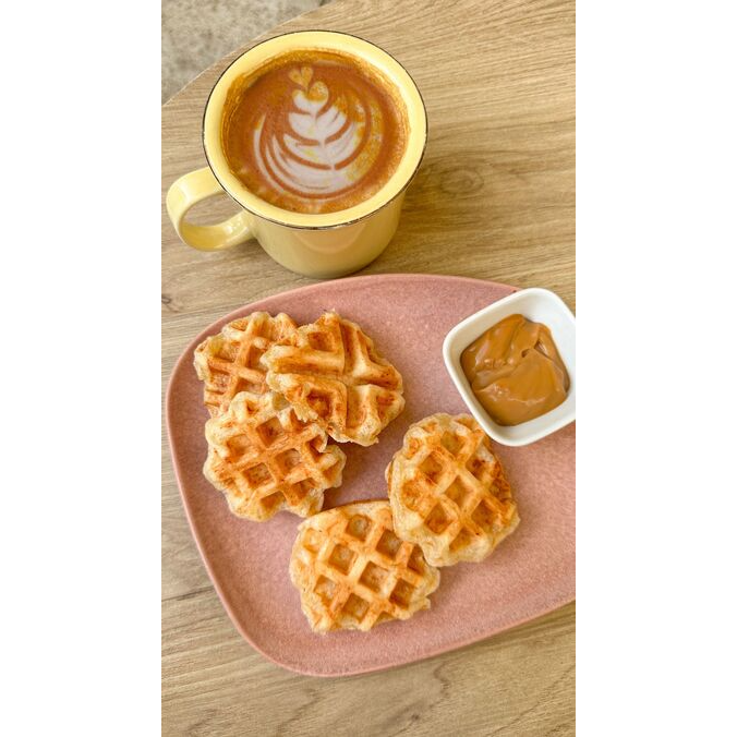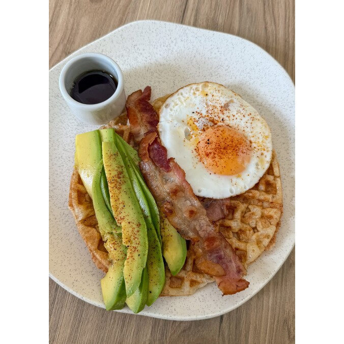 Waffle de pandebono horneado con huevo, aguacate y tocineta.