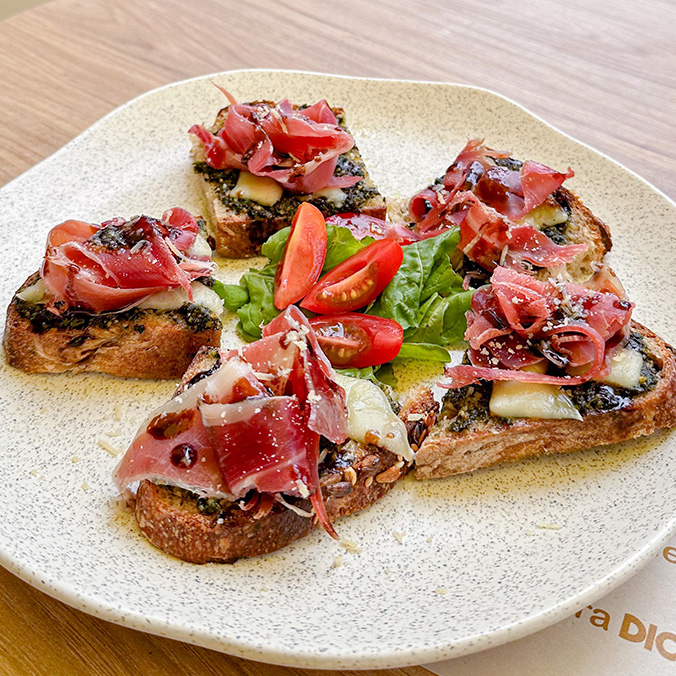 5 Deliciosos montaditos en pan de masa madre con queso, jamón serrano y vinagre balsámico, acompañado de rúgula y tomate cherry.